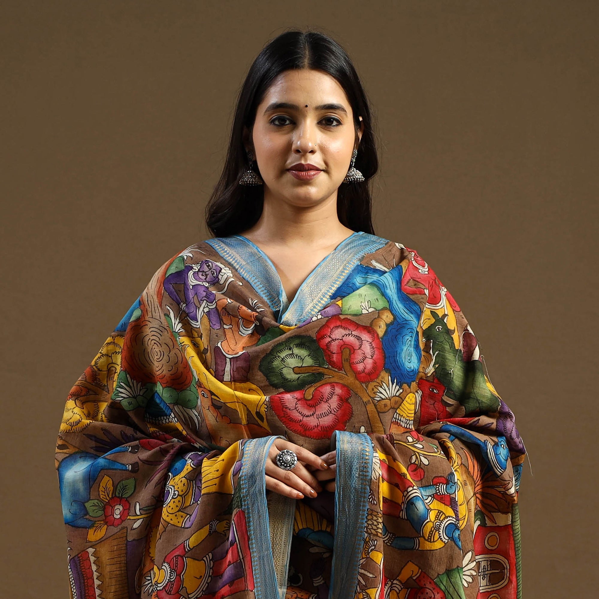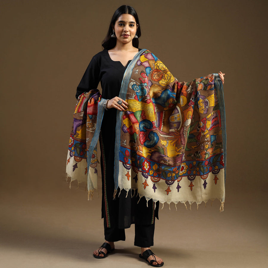 This brown handloom pen-work Kalamkari dupatta is hand-painted on Chanderi silk using the traditional Srikalahasti technique from Andhra Pradesh. Made with natural dyes and drawn freehand by skilled artisans, it features intricate motifs inspired by age-old stories and symbols. Adorned with a zari border and tassels, ideal for festive occasions, family functions, or for those who embrace heritage in their personal style.