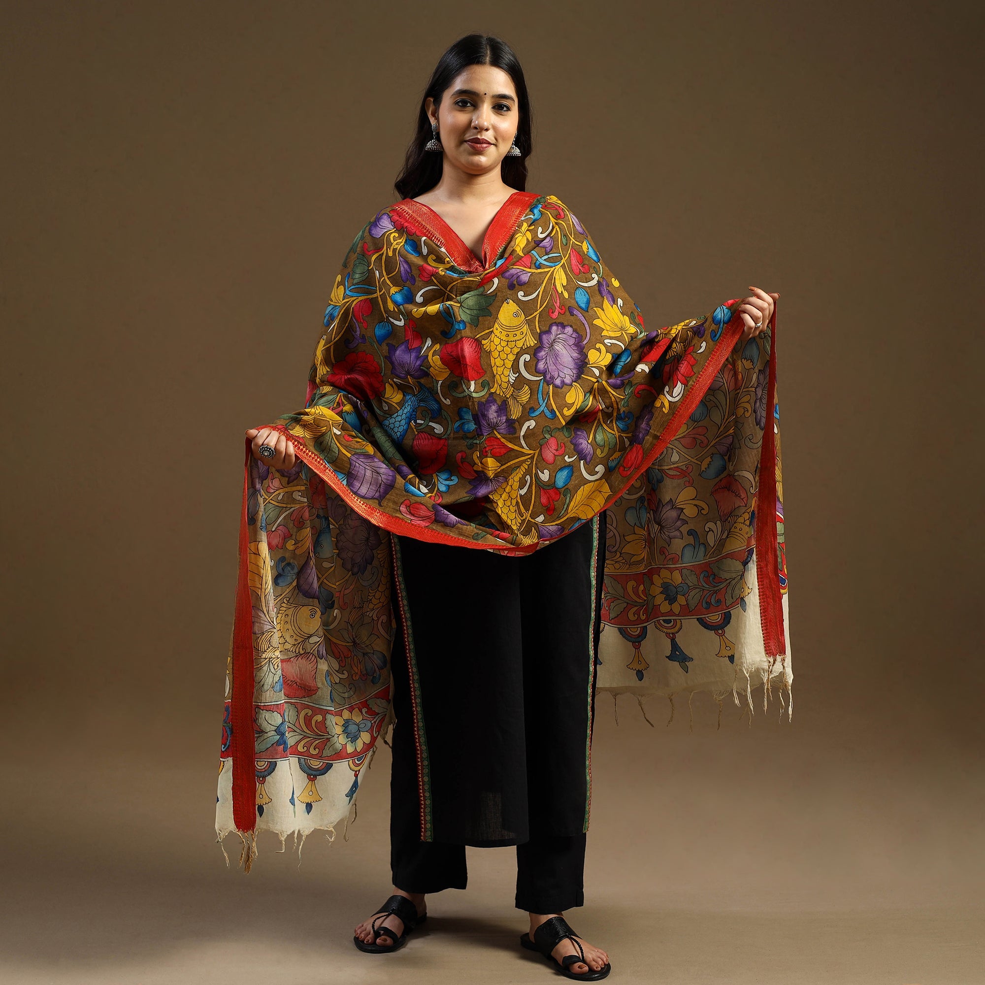 This brown handloom pen-work Kalamkari dupatta is hand-painted on Chanderi silk using the traditional Srikalahasti technique from Andhra Pradesh. Made with natural dyes and drawn freehand by skilled artisans, it features intricate motifs inspired by age-old stories and symbols. Adorned with a zari border and tassels, ideal for festive occasions, family functions, or for those who embrace heritage in their personal style.
