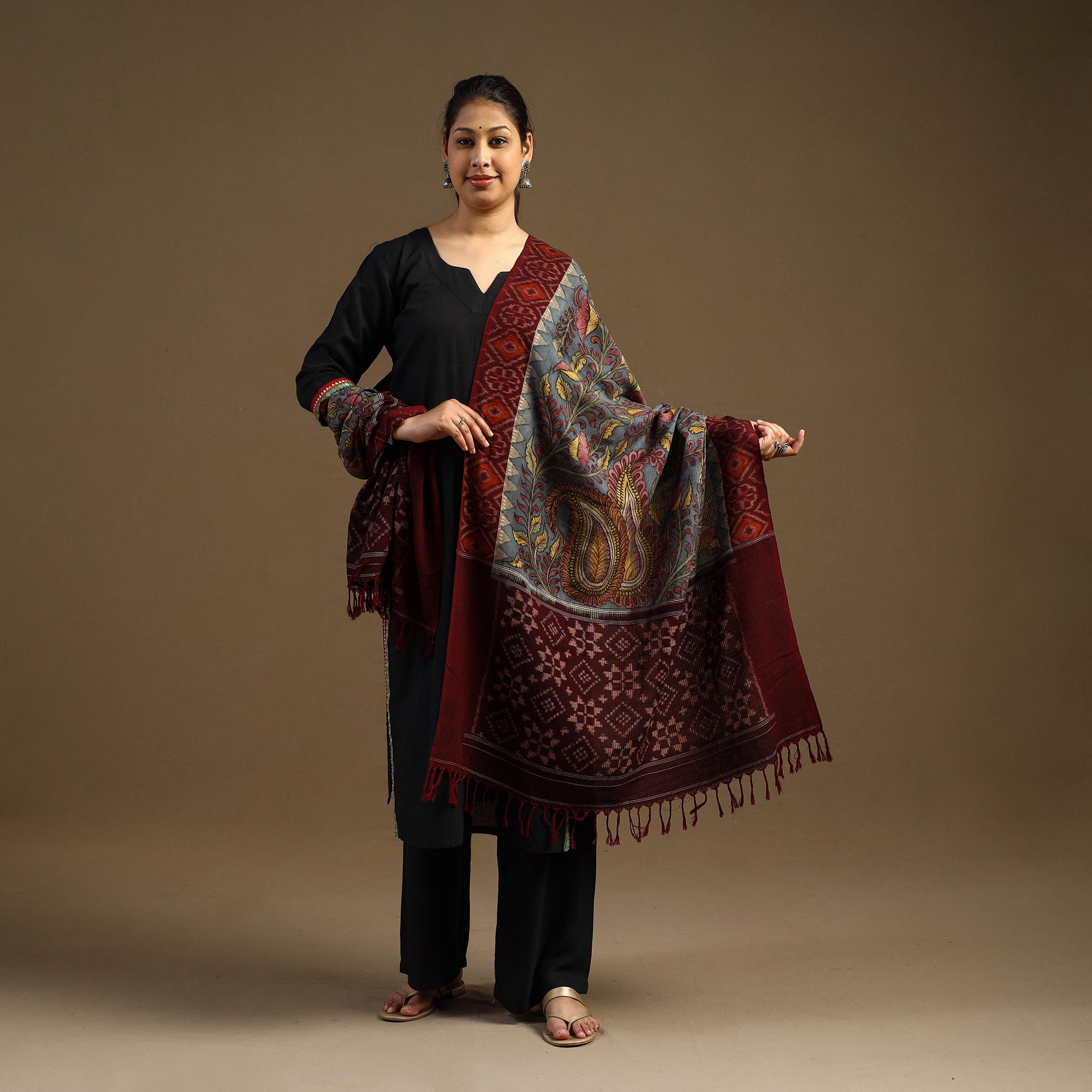 This grey handloom cotton kalamkari dupatta is hand-painted in the traditional style using natural dyes and intricate pen work. The cotton fabric features a fine muslin weave, making it light and breathable. Accented with a bold Ikat border, it beautifully blends two distinct crafts in one piece. A graceful choice for days when you seek comfort with a touch of tradition, whether at work, a get-together, or during everyday wear. As it is handcrafted, slight color bleeding and minor irregularities in design are natural and not considered defects.