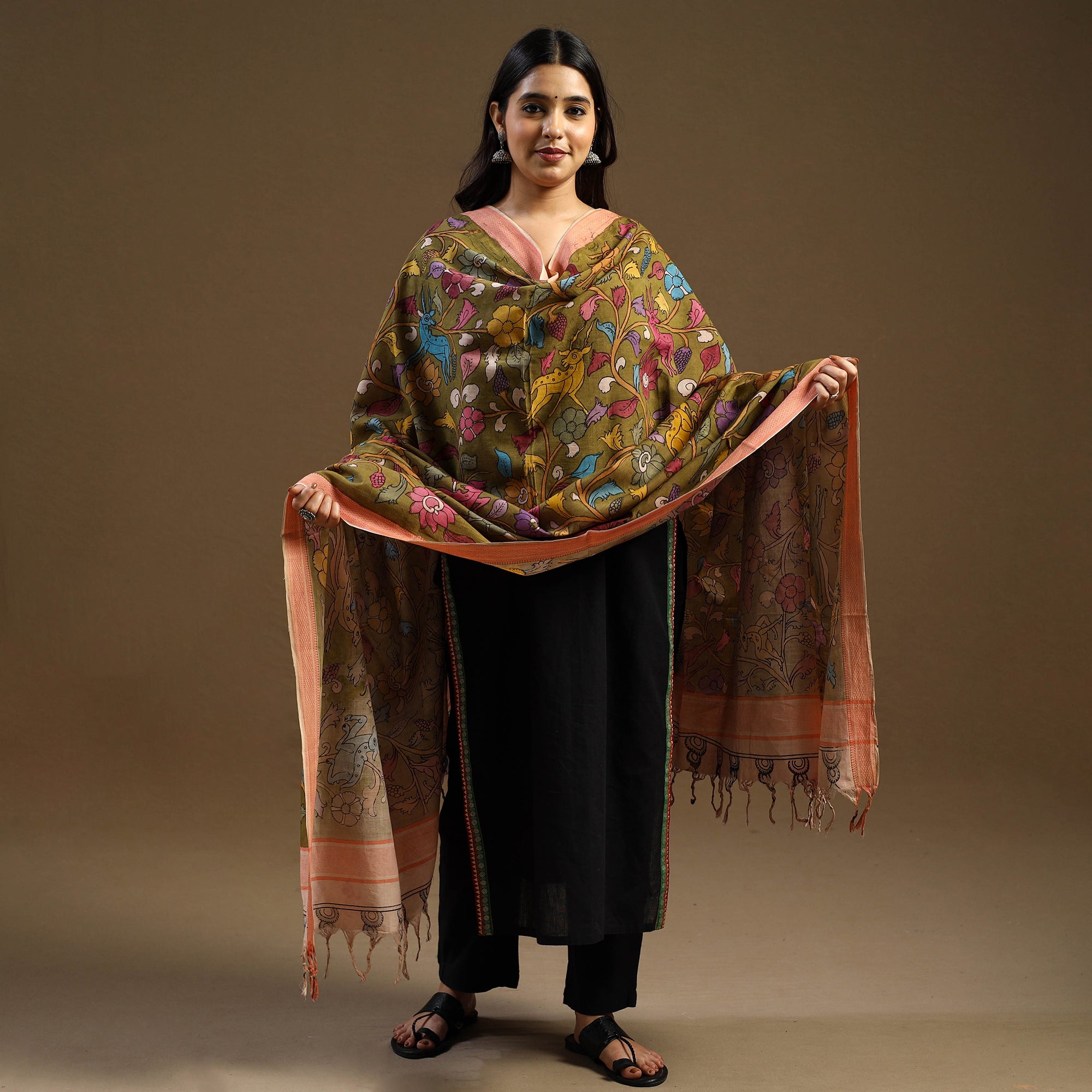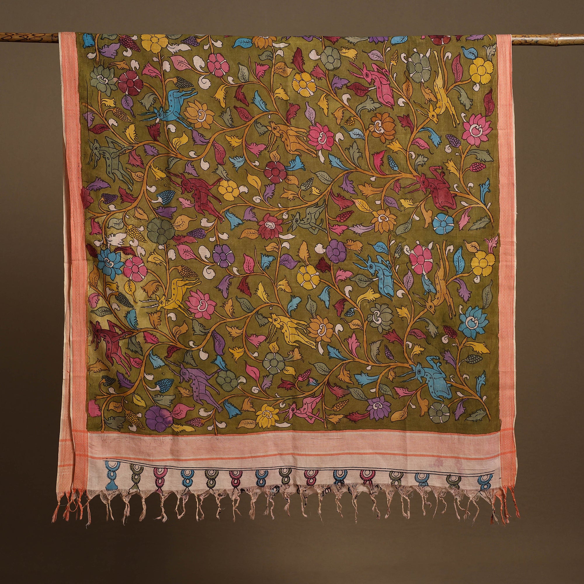 This green handloom pen work kalamkari dupatta is hand-painted on mangalagiri cotton using the traditional srikalahasti technique from Andhra Pradesh. Made with natural dyes and drawn freehand by skilled artisans, it features detailed motifs inspired by age-old stories and symbols. Adorned with a thread border and tassels, ideal for festive occasions, family functions, or for those who embrace heritage in their personal style. As it is hand-painted and handcrafted, slight colour spread and irregularities in design are common and will not be considered defects.