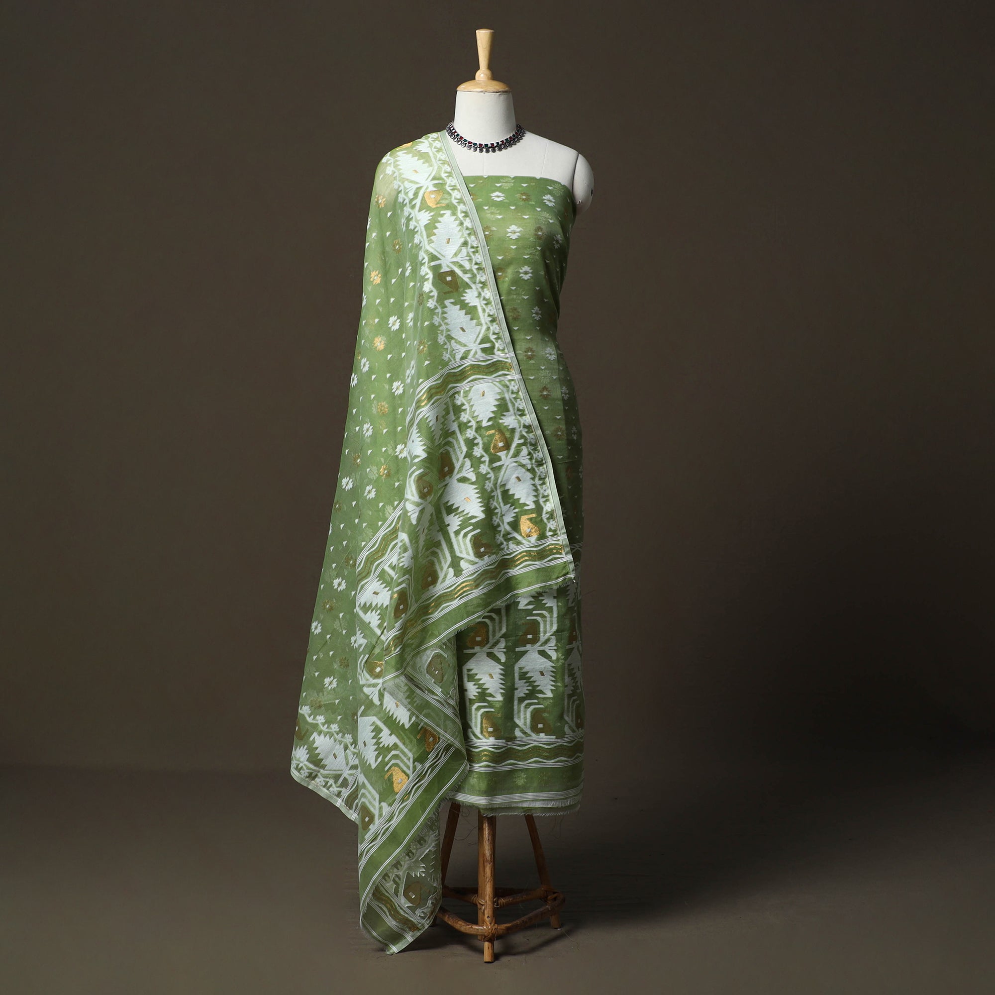Green phulia jamdani silk cotton 2pc unstitched dress material, crafted using Bengal’s intricate extra-weft weaving technique that creates patterns resembling embroidery on the loom. Each motif is delicately woven with small shuttles, making Jamdani one of the most time intensive and treasured weaving traditions. This set includes kurta fabric with a coordinated dupatta, ideal for small festivities, family get-togethers and graceful day outings.