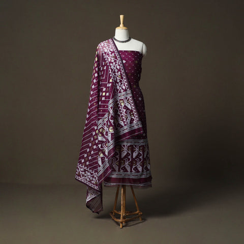 Purple phulia jamdani silk cotton 2pc unstitched dress material, crafted using Bengal’s intricate extra-weft weaving technique that creates patterns resembling embroidery on the loom. Each motif is delicately woven with small shuttles, making Jamdani one of the most time intensive and treasured weaving traditions. This set includes kurta fabric with a coordinated dupatta, ideal for small festivities, family get-togethers and graceful day outings.