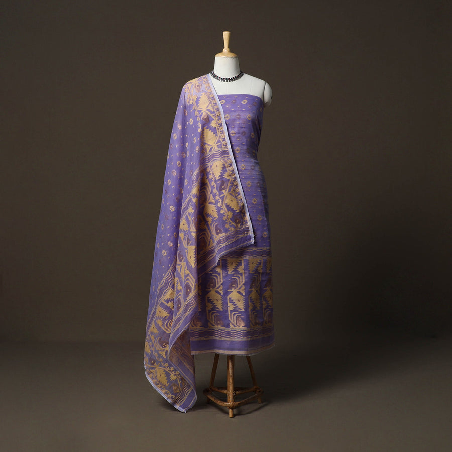 Phulia jamdani silk cotton 2pc unstitched dress material, crafted using Bengal’s intricate extra-weft weaving technique that creates patterns resembling embroidery on the loom. Each motif is delicately woven with small shuttles, making Jamdani one of the most time intensive and treasured weaving traditions. This set includes kurta fabric with a coordinated dupatta, ideal for small festivities, family get-togethers and graceful day outings.