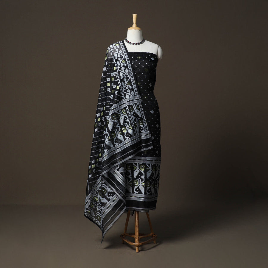 Phulia jamdani silk cotton 2pc unstitched dress material, crafted using Bengal’s intricate extra-weft weaving technique that creates patterns resembling embroidery on the loom. Each motif is delicately woven with small shuttles, making Jamdani one of the most time intensive and treasured weaving traditions. This set includes kurta fabric with a coordinated dupatta, ideal for small festivities, family get-togethers and graceful day outings.