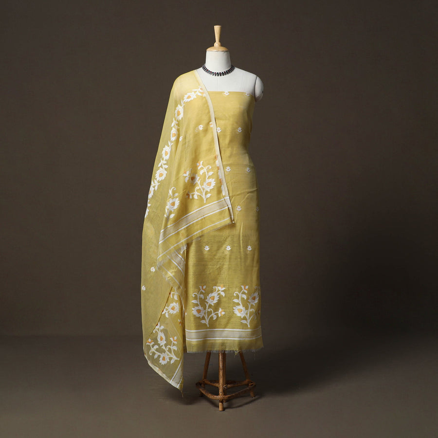 Phulia jamdani silk cotton 2pc unstitched dress material, crafted using Bengal’s intricate extra-weft weaving technique that creates patterns resembling embroidery on the loom. Each motif is delicately woven with small shuttles, making Jamdani one of the most time intensive and treasured weaving traditions. This set includes kurta fabric with a coordinated dupatta, ideal for small festivities, family get-togethers and graceful day outings.