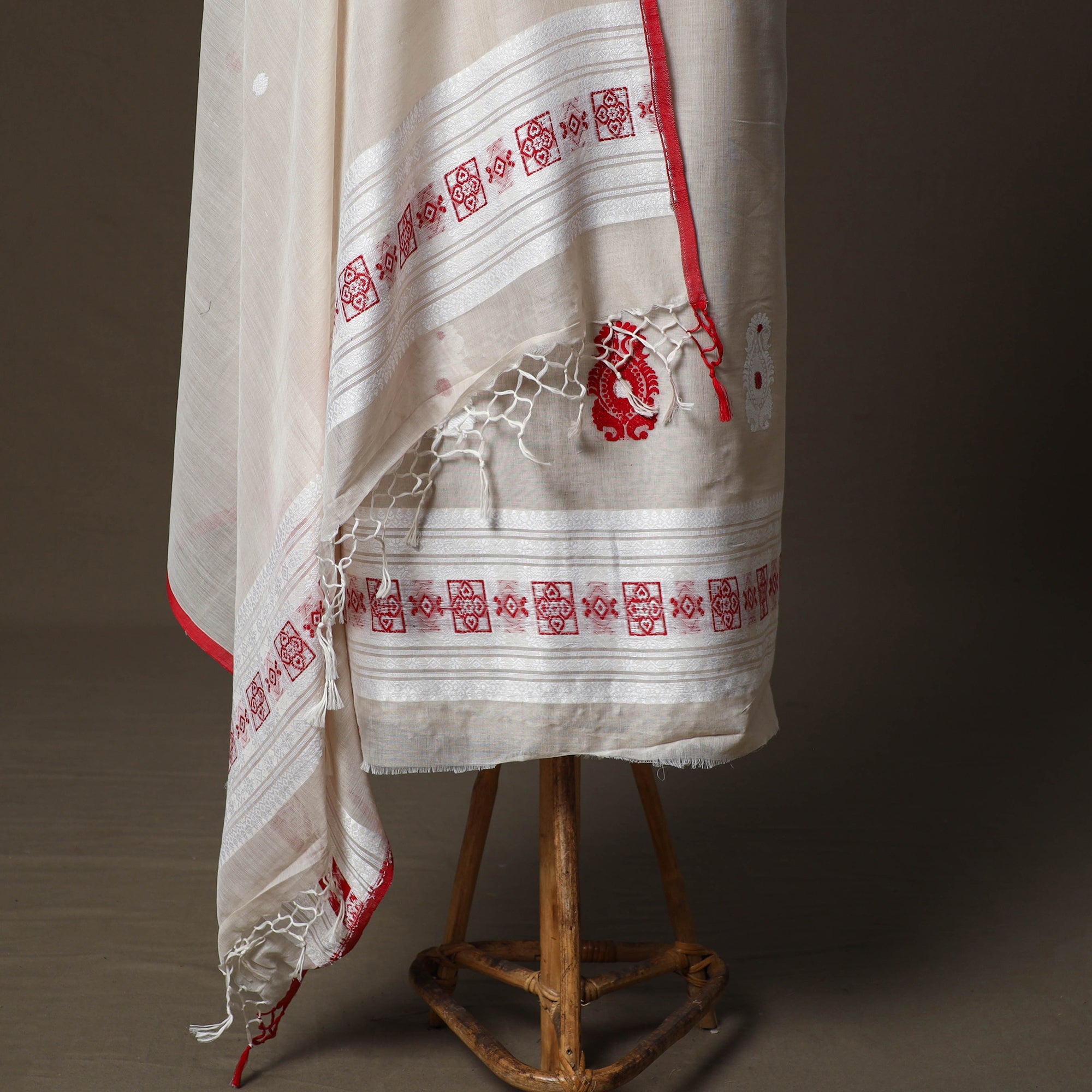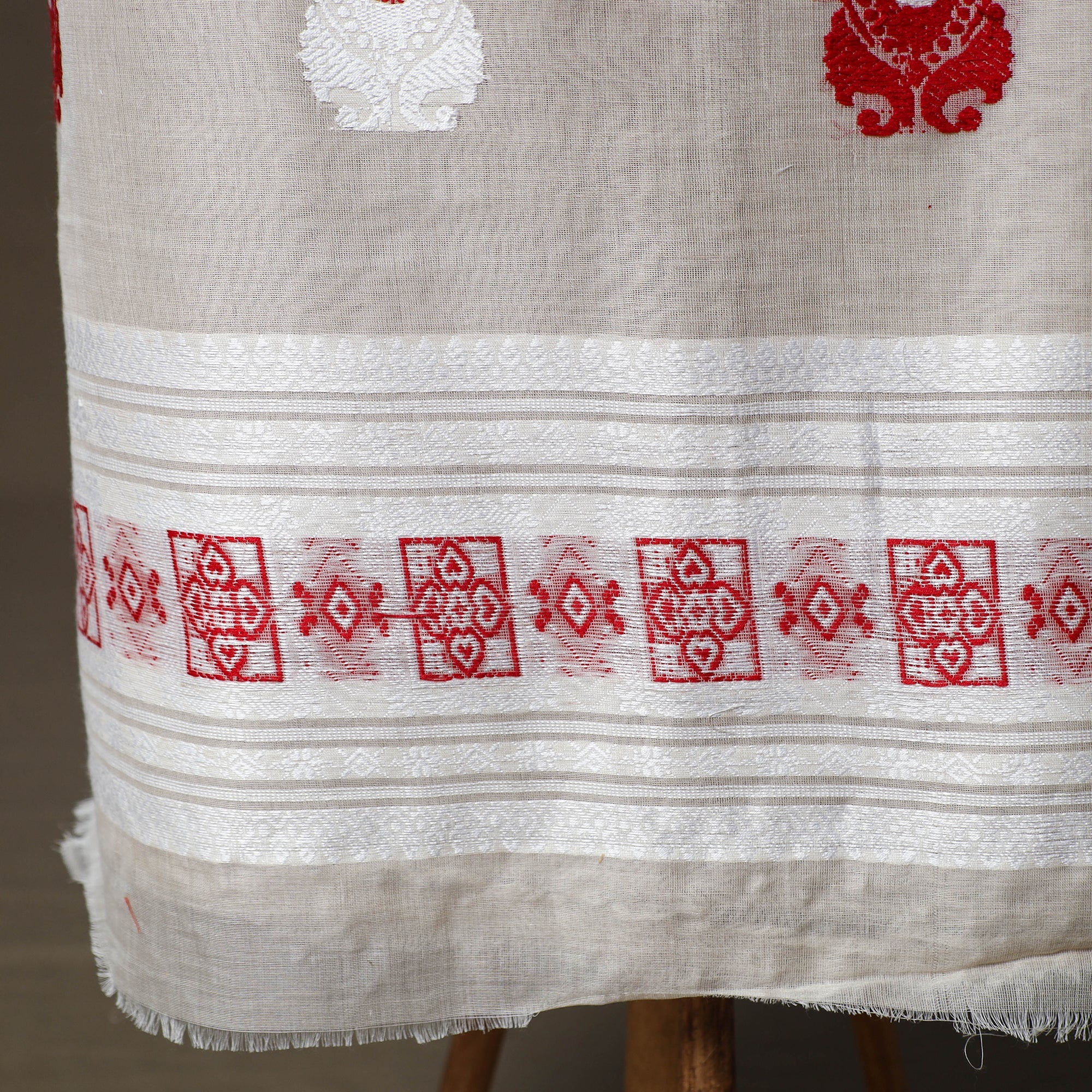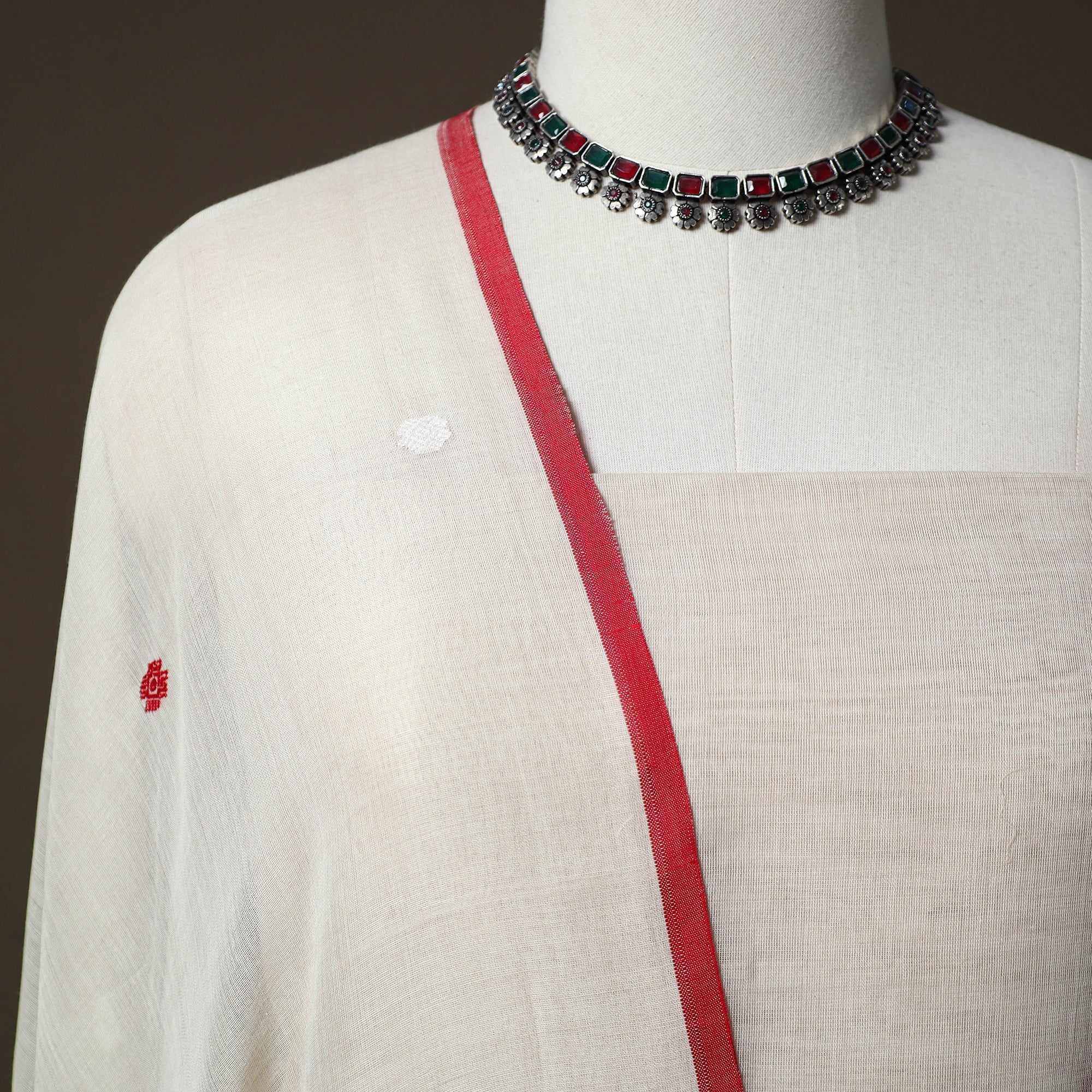 Phulia jamdani cotton 2pc unstitched dress material, crafted using Bengal’s intricate extra-weft weaving technique that creates patterns resembling embroidery on the loom. Adorned with elegant zari buti, Jamdani is among the most time-intensive and treasured weaving traditions. This set includes kurta fabric with a coordinated dupatta, ideal for small festivities, family get-togethers and graceful day outings.
