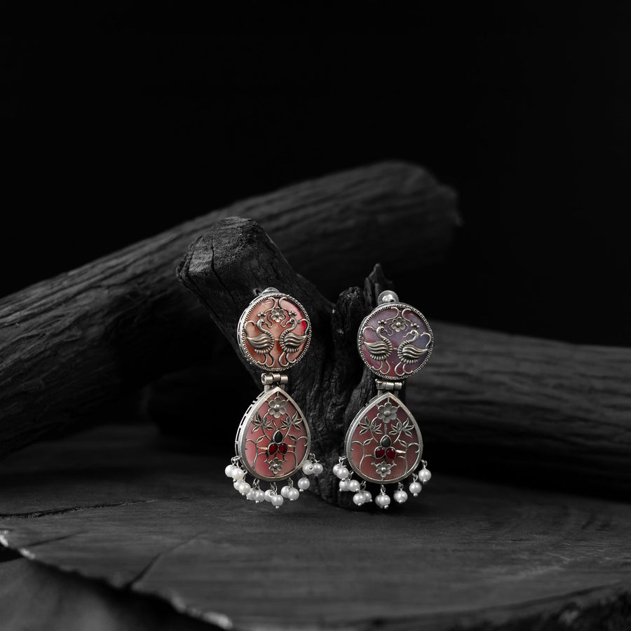 PInk oxidised handcrafted earrings made with a blend of metal, stones, pearls, beads, and fine detailing. Perfect for festive occasions, weddings, casual outings, office wear, or vacations. Their elegant black and silver tones pair beautifully with everything from casual jeans and flowy dresses to chic office ensembles. A meaningful gift for mother, sister, wife, or girlfriend adding a beautiful touch of tradition to every moment.