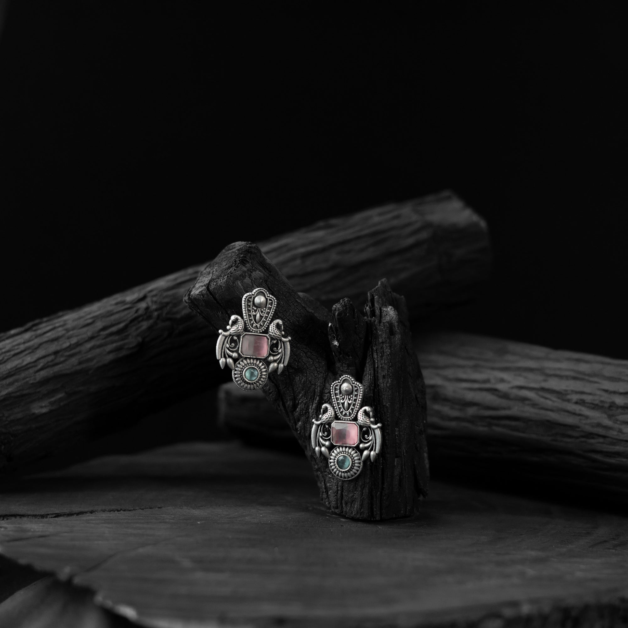 Oxidised handcrafted pink earrings made with a blend of metal, stones and fine detailing. Perfect for festive occasions, weddings, casual outings, office wear, or vacations. Their elegant black and silver tones pair beautifully with everything from casual jeans and flowy dresses to chic office ensembles. A meaningful gift for mother, sister, wife, or girlfriend adding a beautiful touch of tradition to every moment.