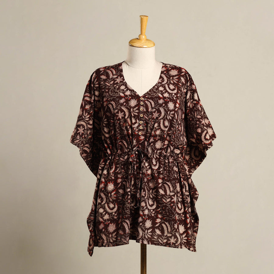 Stay comfy and stylish in this maroon pintuck bagru hand block print mosaic fusion cotton kaftan. The short loose fitting design features with long flowing sleeves offering comfort. Perfect for casual outings beach days or lounging at home this kaftan adds a traditional yet fashionable touch to your wardrobe.