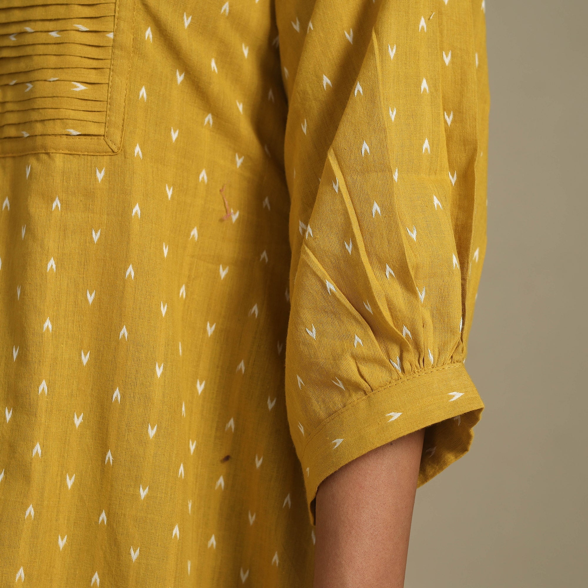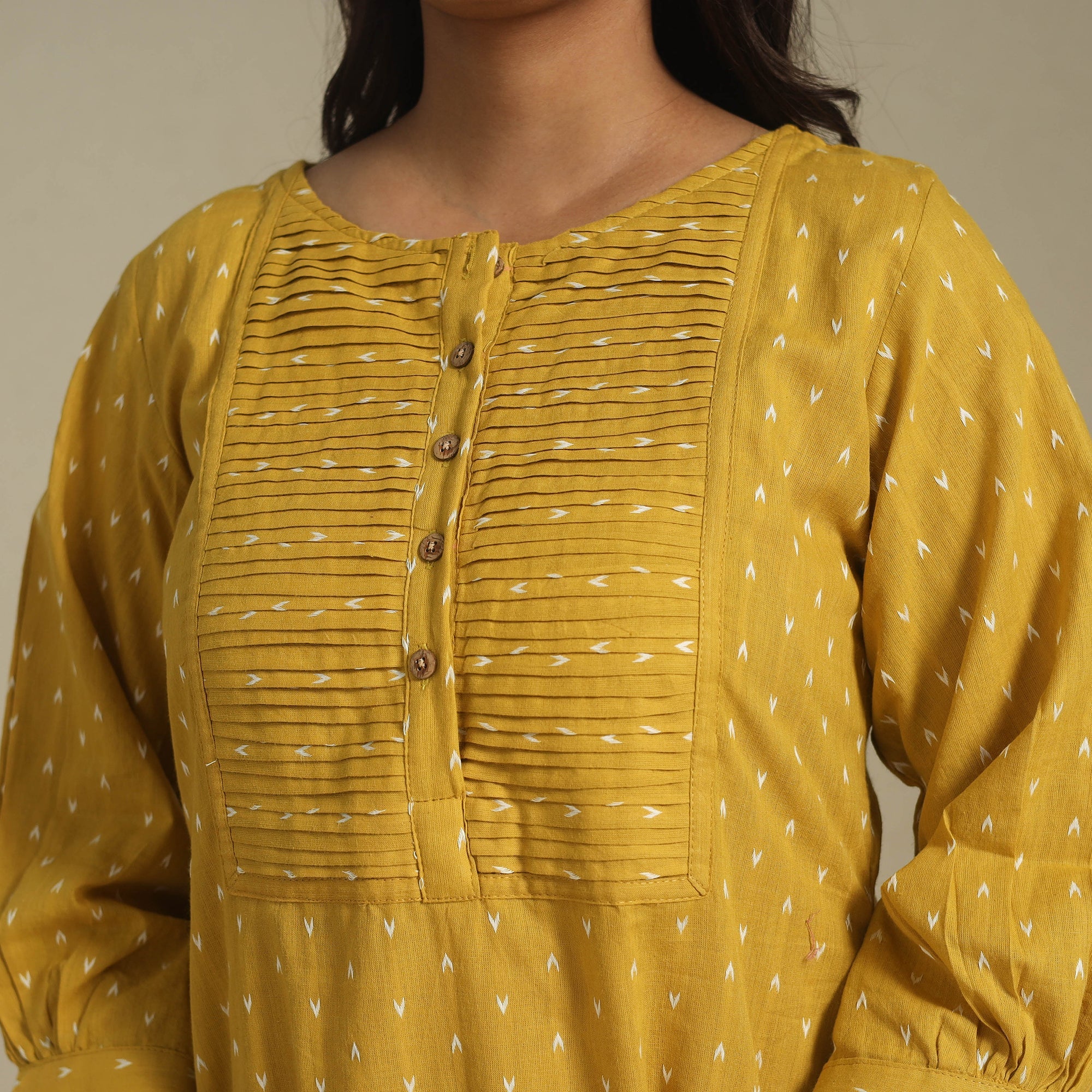 This yellow pintuck cotton jacquard dress blends traditional weaving with a contemporary design. Crafted from breathable cotton and adorned with intricate jacquard patterns, it ensures all-day comfort. The front pintuck detailing adds graceful style, while the side pocket provides everyday convenience. Perfect for office wear, casual outings, or relaxed get-togethers, this dress strikes the right balance between tradition and modern practicality.