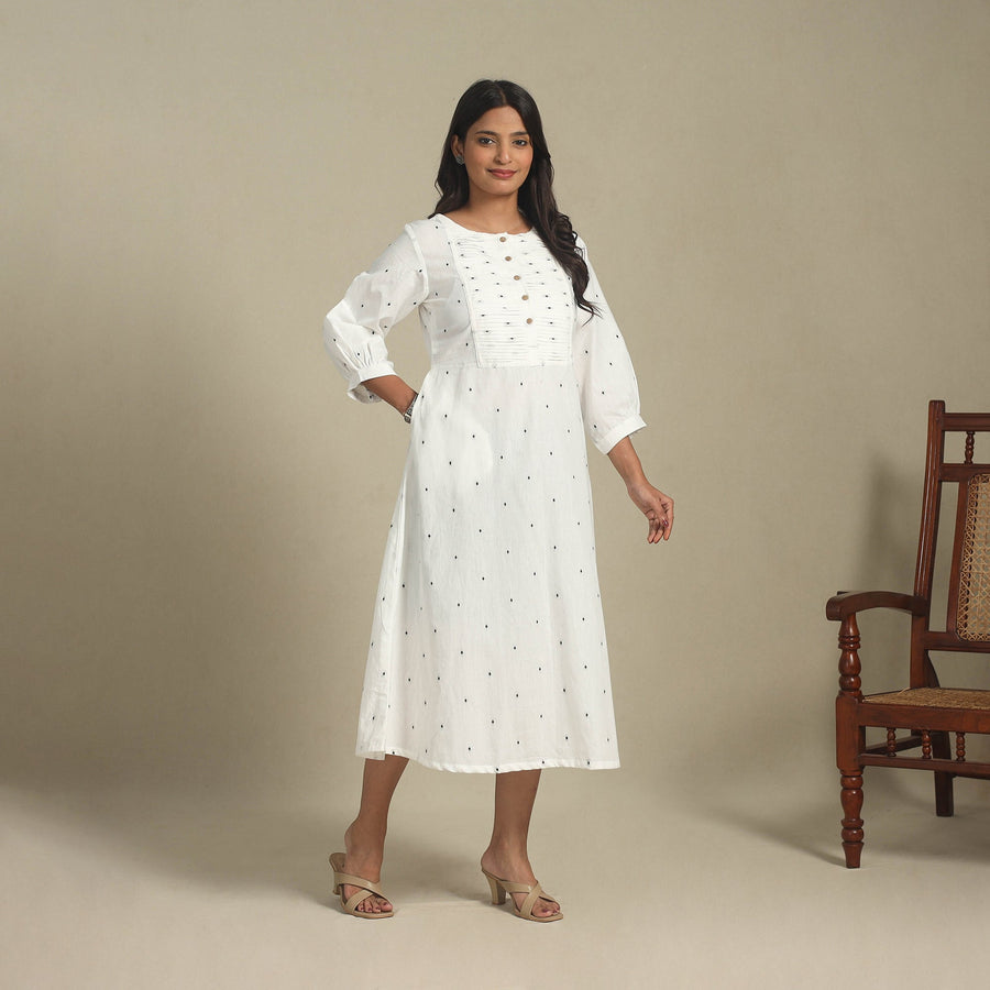 This white pintuck cotton jacquard dress blends traditional weaving with a contemporary design. Crafted from breathable cotton and adorned with intricate jacquard patterns, it ensures all-day comfort. The front pintuck detailing adds graceful style, while the side pocket provides everyday convenience. Perfect for office wear, casual outings, or relaxed get-togethers, this dress strikes the right balance between tradition and modern practicality.