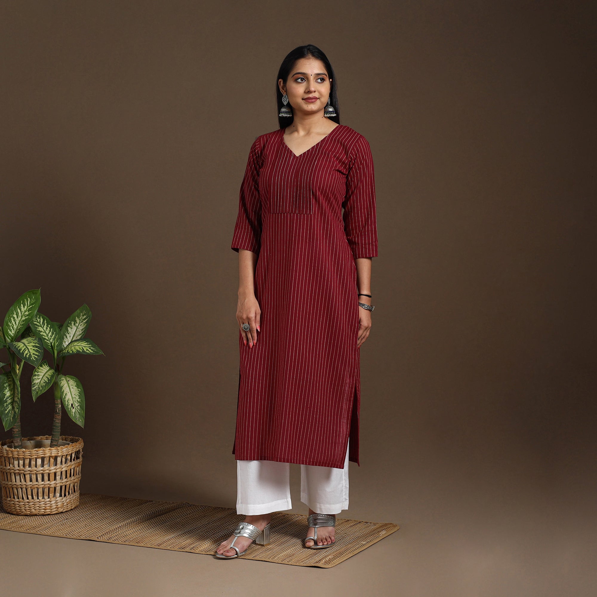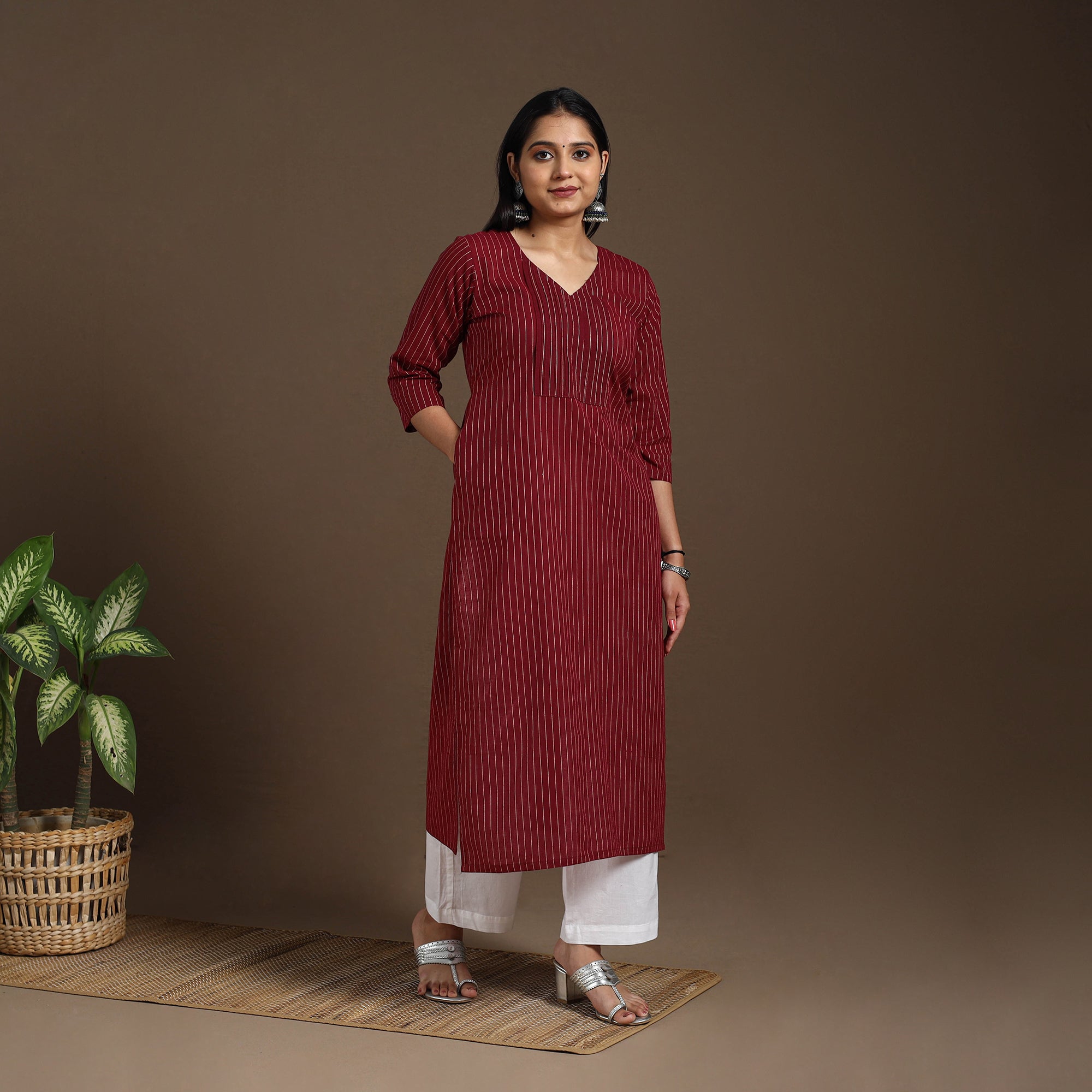 Step into effortless style with this maroon pintuck straight cotton jacquard kurta. The intricate jacquard weave adds a subtle texture, while breathable cotton ensures all-day ease. It also features a handy side pocket for your daily essentials. Whether it's for office hours, casual outings, or festive moments, this kurta is perfect for everyday wear.