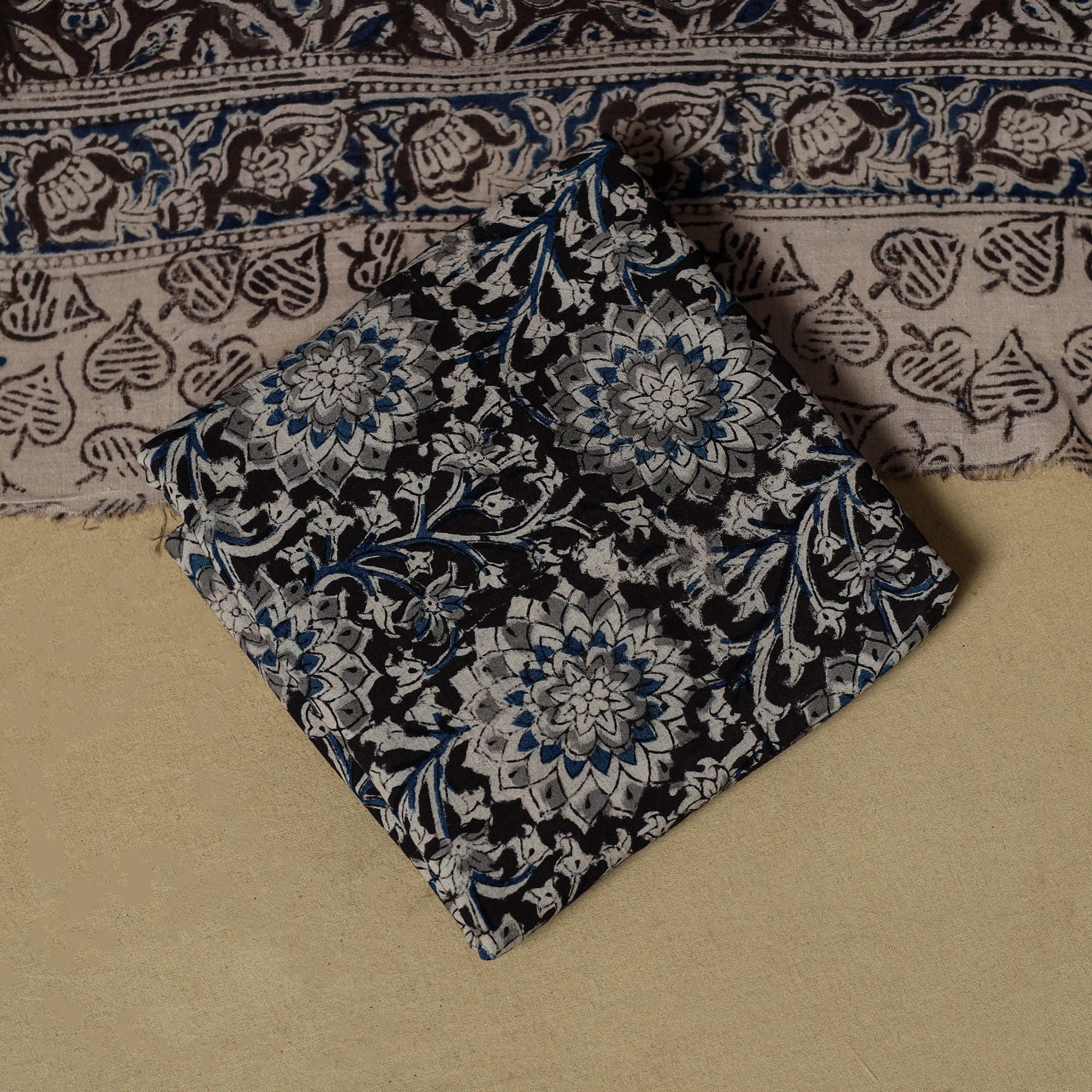 Black plain 3pc unstitched dress material Crafted by skilled artisans from Telangana, features border detailing on the kurta fabric. The set includes a kalamkari block-printed dupatta and bottom, adding a touch of traditional design. Comfortable, versatile and easy to tailor, it’s suitable for everyday wear or creating a simple graceful look.