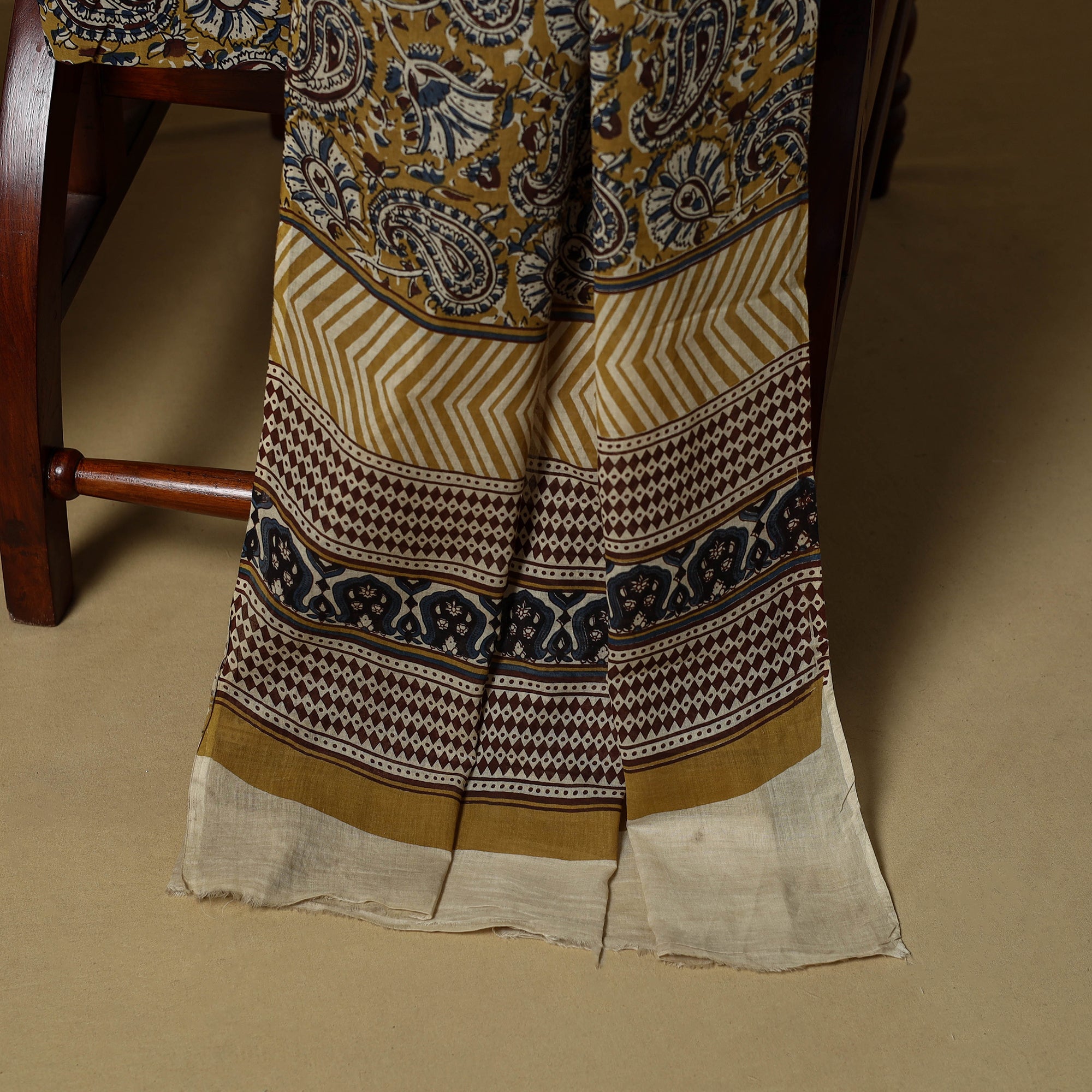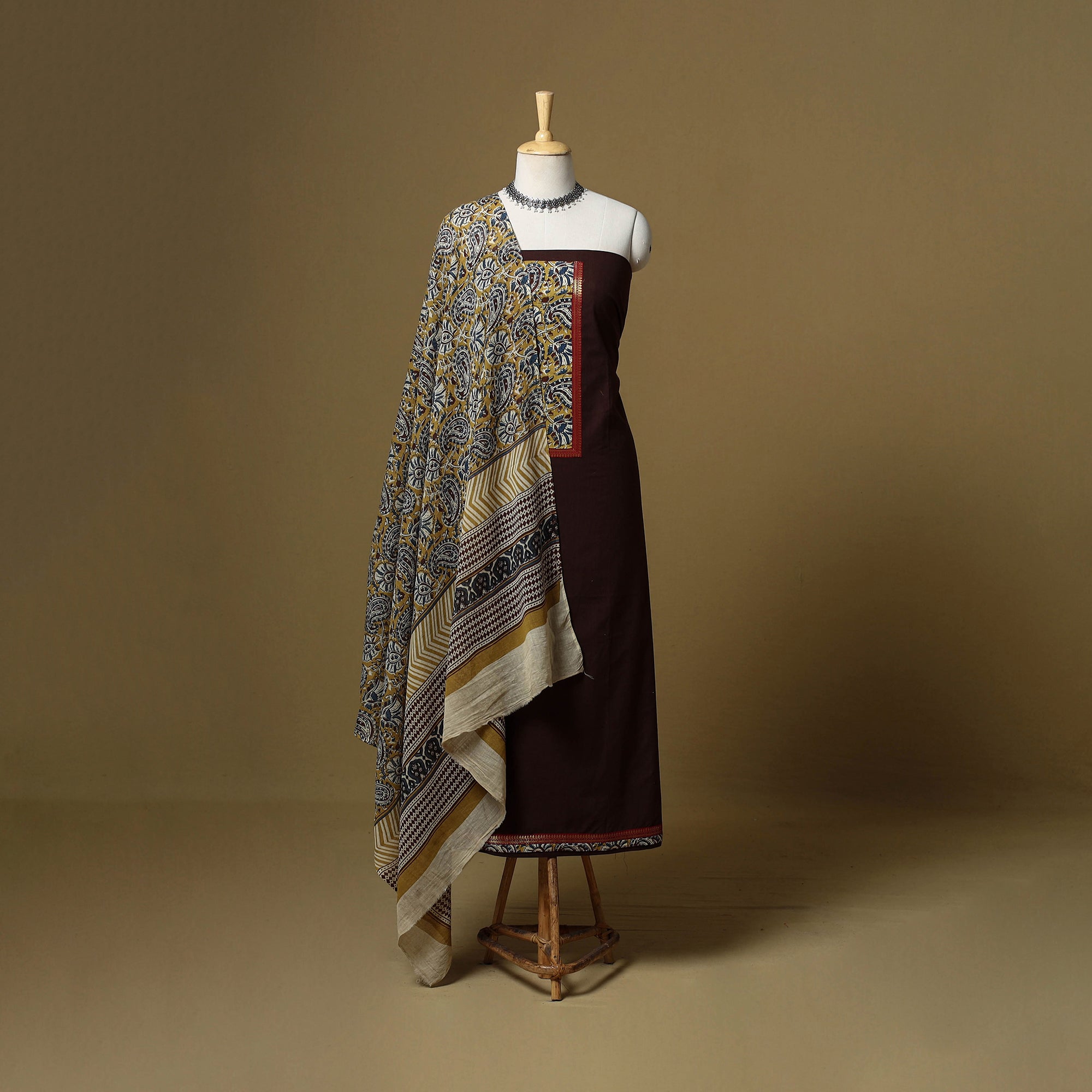 Brown plain 3pc unstitched dress material Crafted by skilled artisans from Telangana, features border detailing on the kurta fabric. The set includes a kalamkari screen-printed dupatta and bottom, adding a touch of traditional design. Comfortable, versatile and easy to tailor, it’s suitable for everyday wear or creating a simple graceful look.