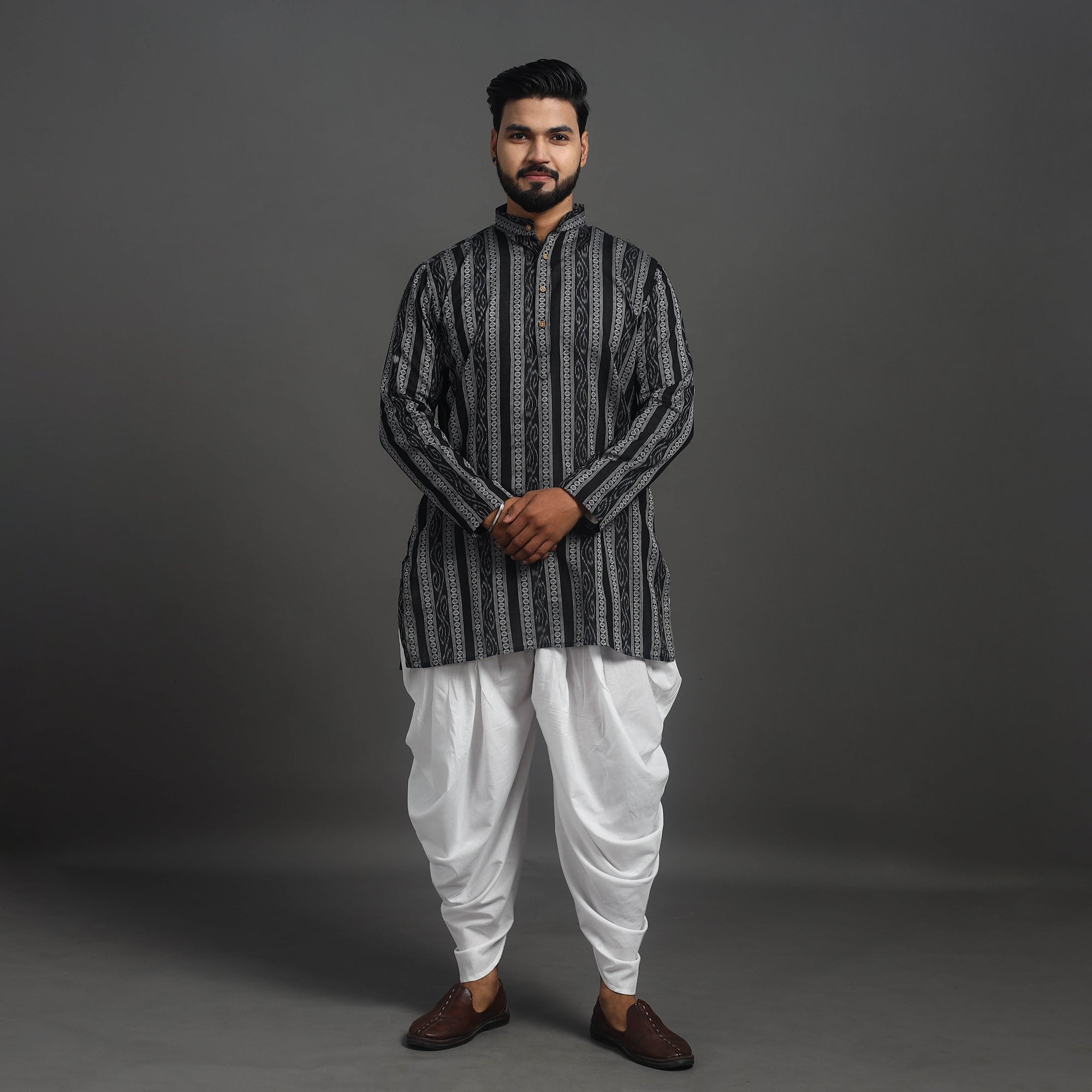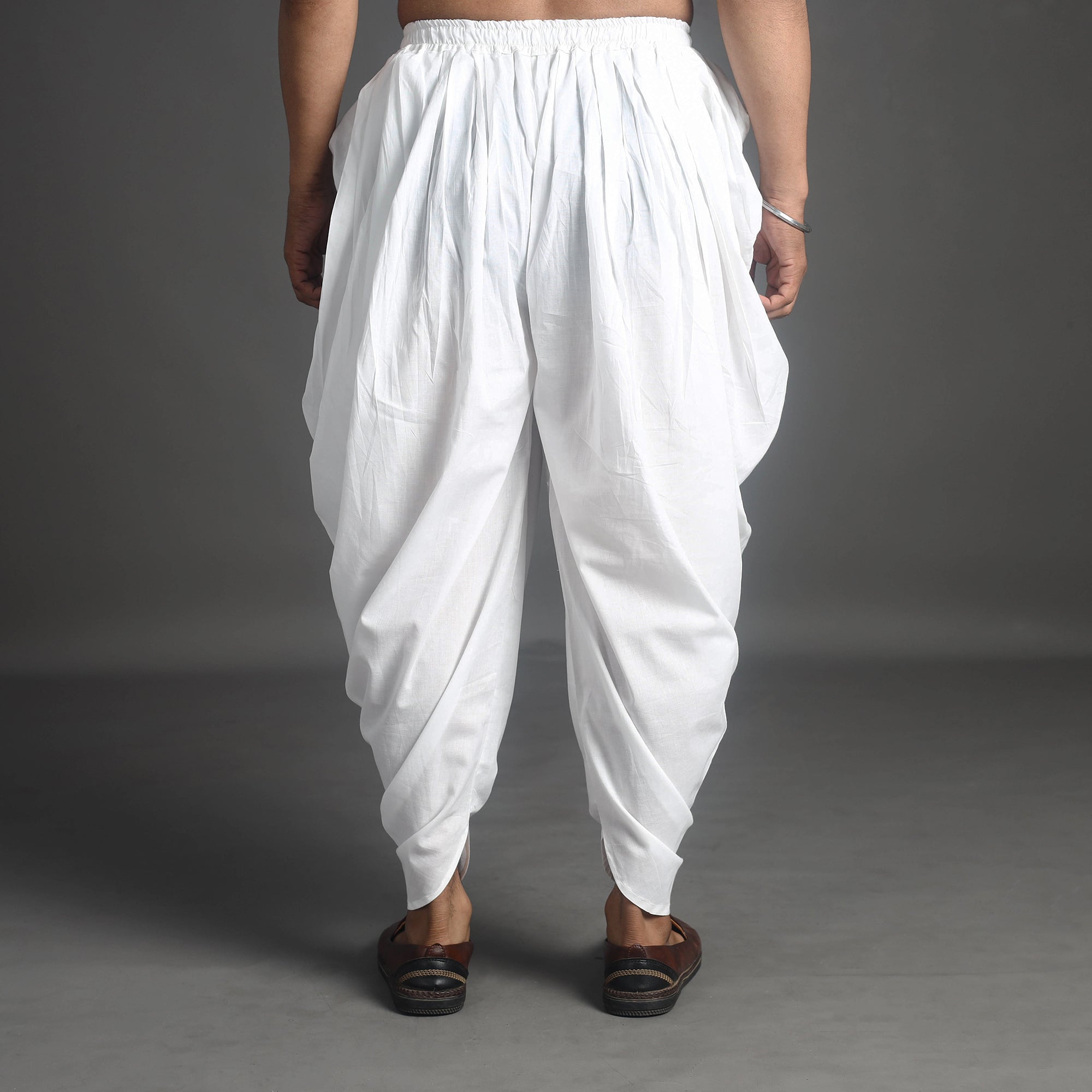 Comfort with this white plain cotton dhoti for men's. This pant has an elasticated waist, which ensures comfort. Made from breathable fabric, this pant is characterized by its loose fitting, making it an ideal choice for various occasions from weddings to festivals.