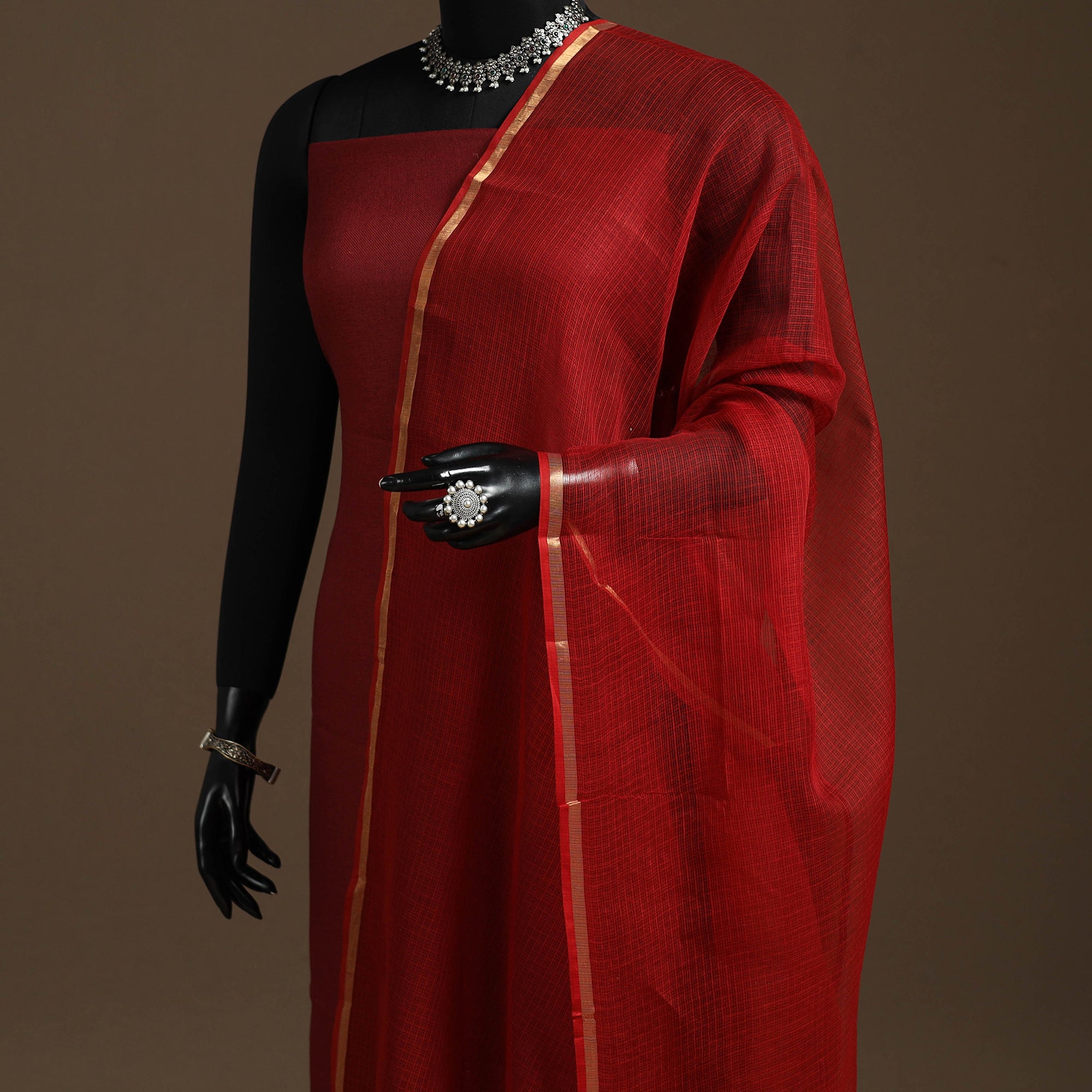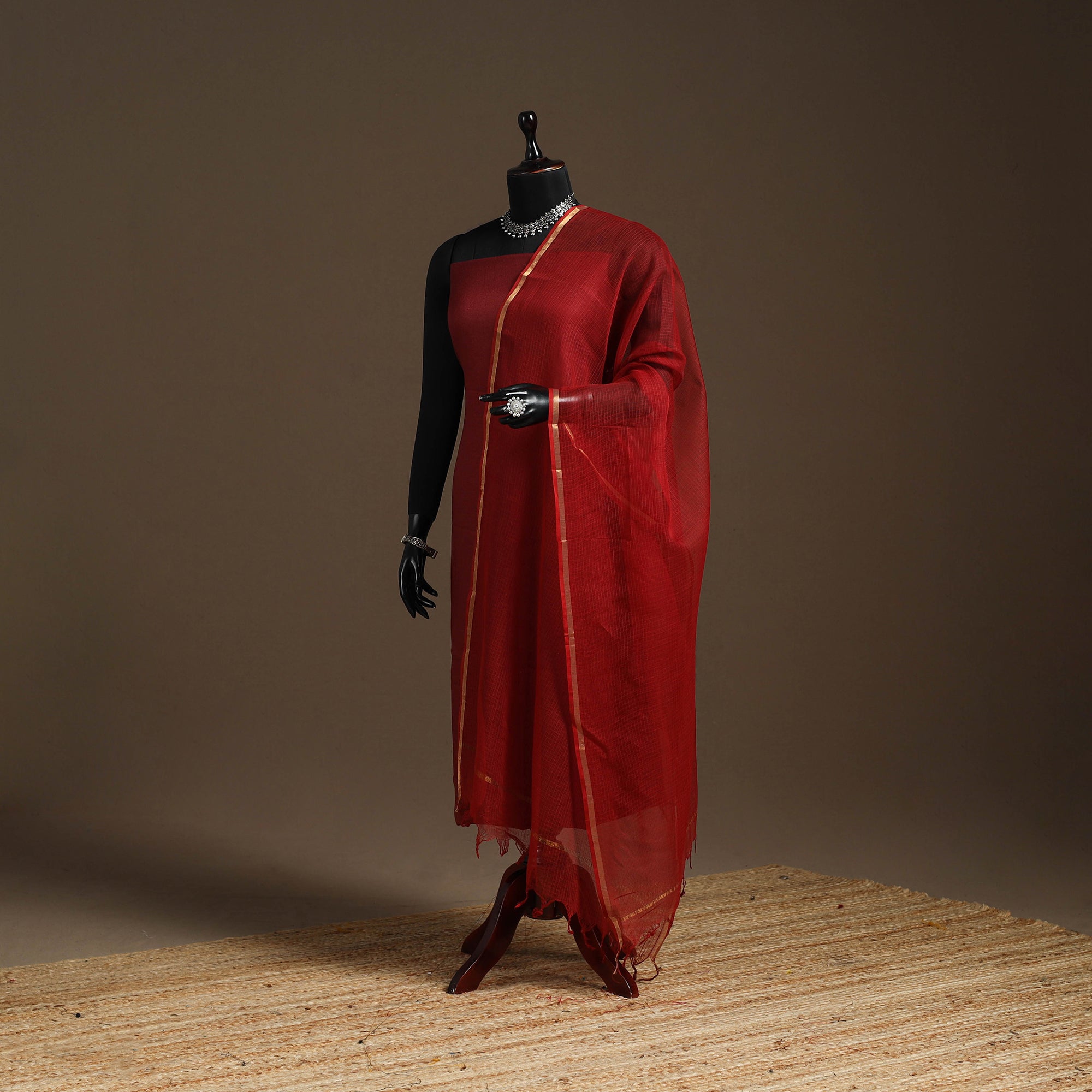 Red plain kota doria cotton dupatta. Crafted by skilled artisans from Kota, Rajasthan, it is lightweight and breathable. The use of natural colours enhances its authenticity, while the zari border adds to its charm, making it ideal for pairing with both ethnic and fusion outfits.