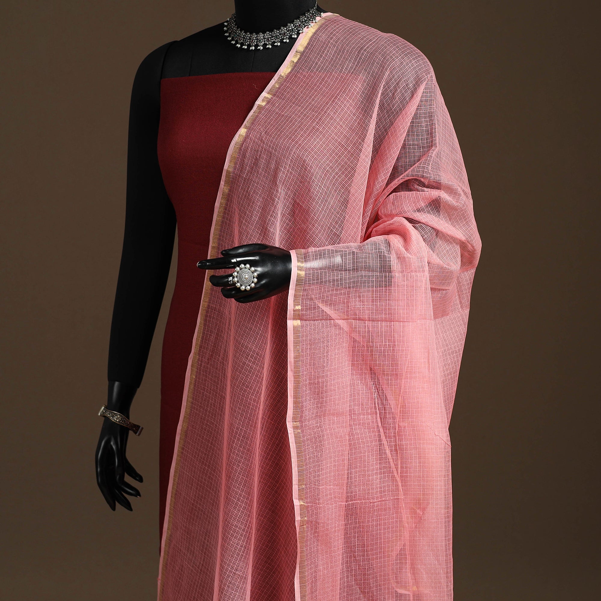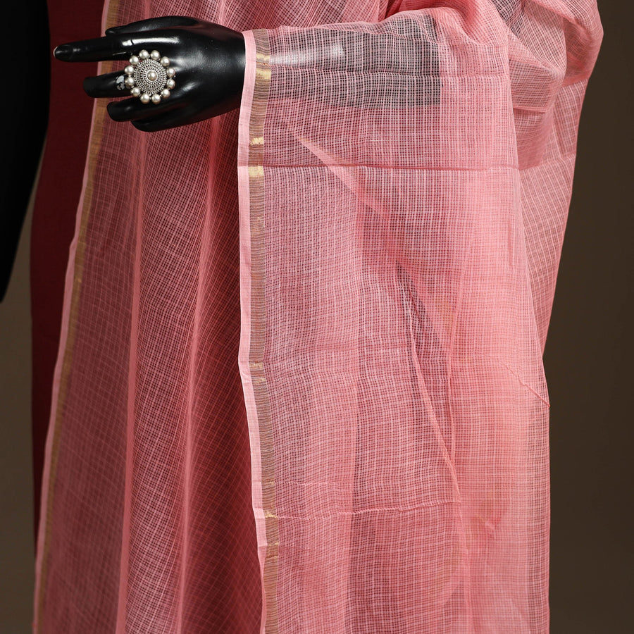 An exclusive pink plain cotton kota doria dupatta that perfectly blends tradition with elegance. Crafted by skilled artisans from Kota, Rajasthan, it is lightweight and breathable. The use of natural colours enhances its authenticity, while the zari border adds to its charm, making it ideal for pairing with both ethnic and fusion outfits.