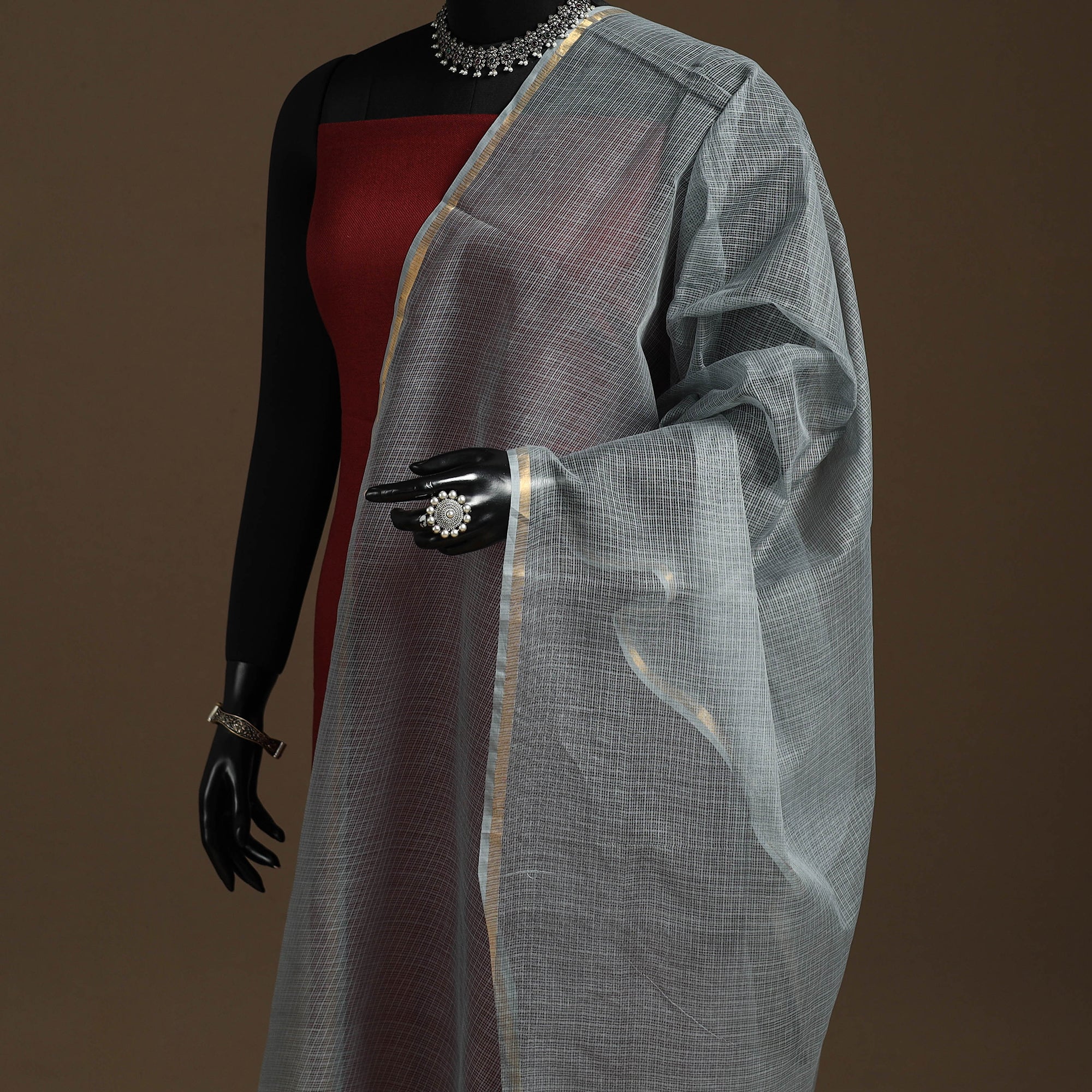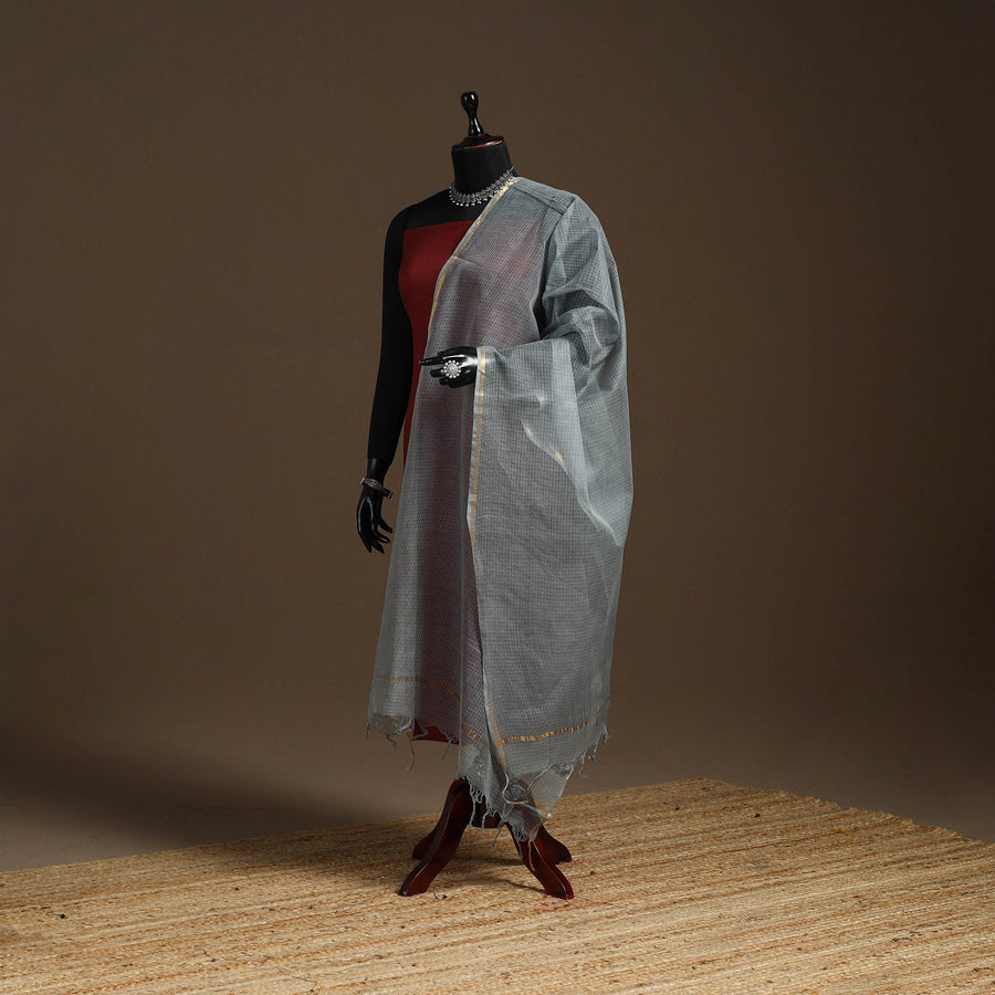 Grey plain kota doria cotton dupatta. Crafted by skilled artisans from Kota, Rajasthan, it is lightweight and breathable. The use of natural colours enhances its authenticity, while the zari border adds to its charm, making it ideal for pairing with both ethnic and fusion outfits.