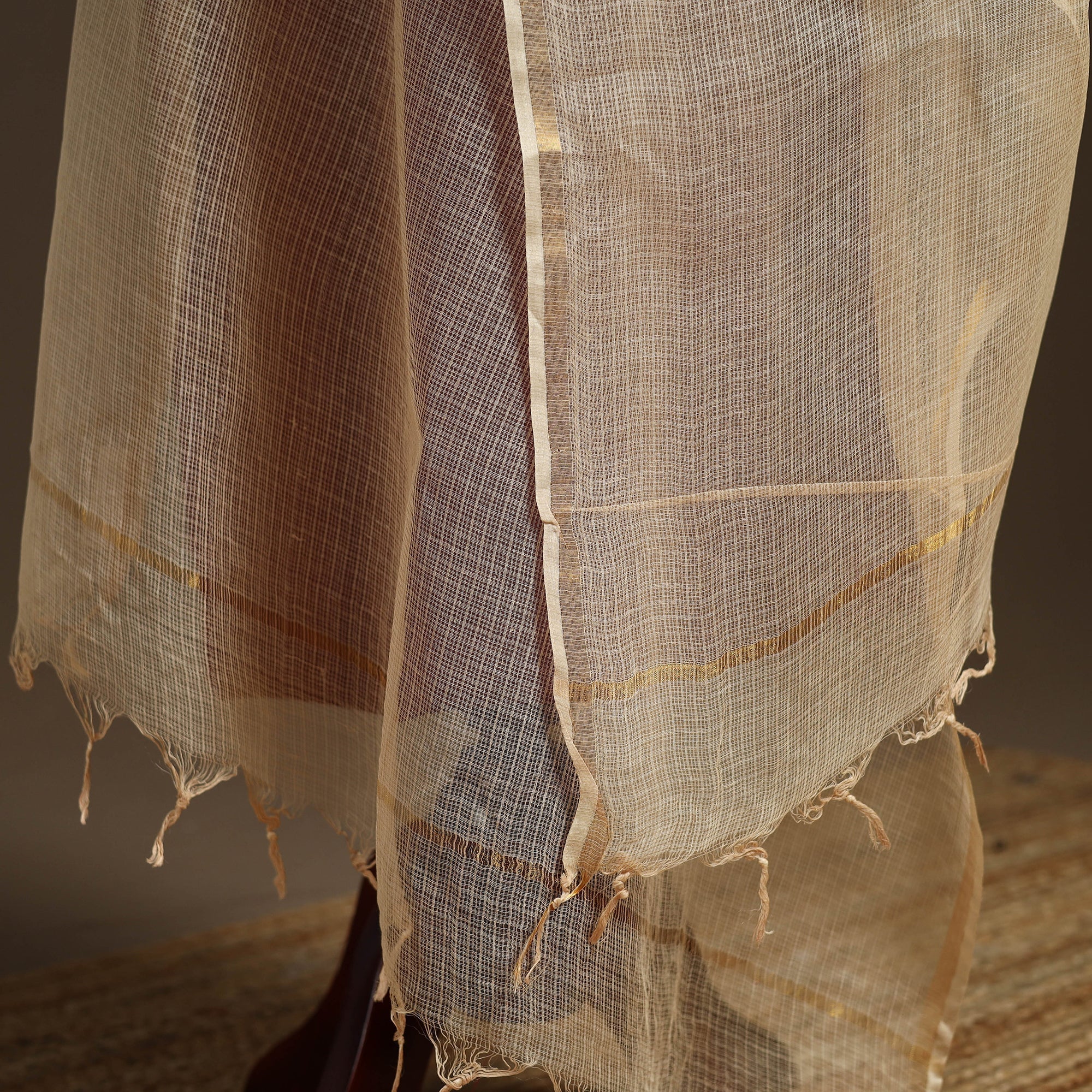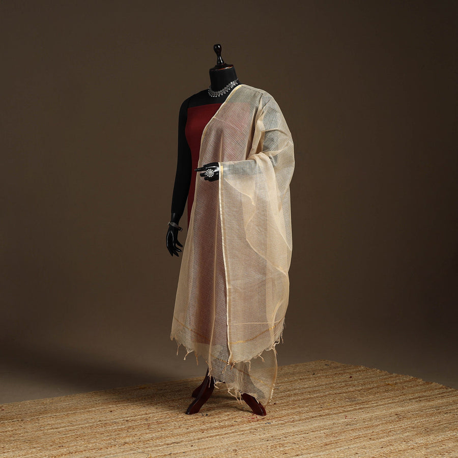 Beige plain kota doria cotton dupatta. Crafted by skilled artisans from Kota, Rajasthan, it is lightweight and breathable. The use of natural colours enhances its authenticity, while the zari border adds to its charm, making it ideal for pairing with both ethnic and fusion outfits.