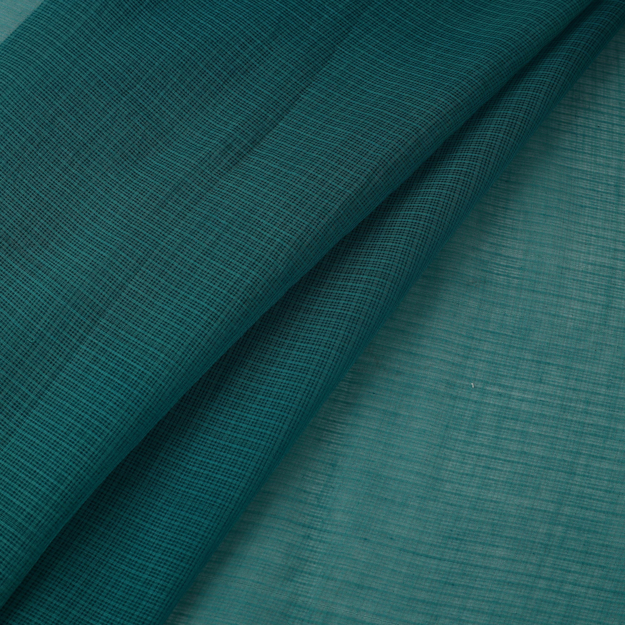 This green plain cotton kota doria fabric is crafted by artisans in Kota, Rajasthan. Known for its airy weave and lightweight texture, Kota Doria blends cotton and silk yarns, where the threads are finely interwoven to create check patterns. The use of natural colors enhances its authenticity. Ideal for making elegant kurtas, dupattas or sarees.