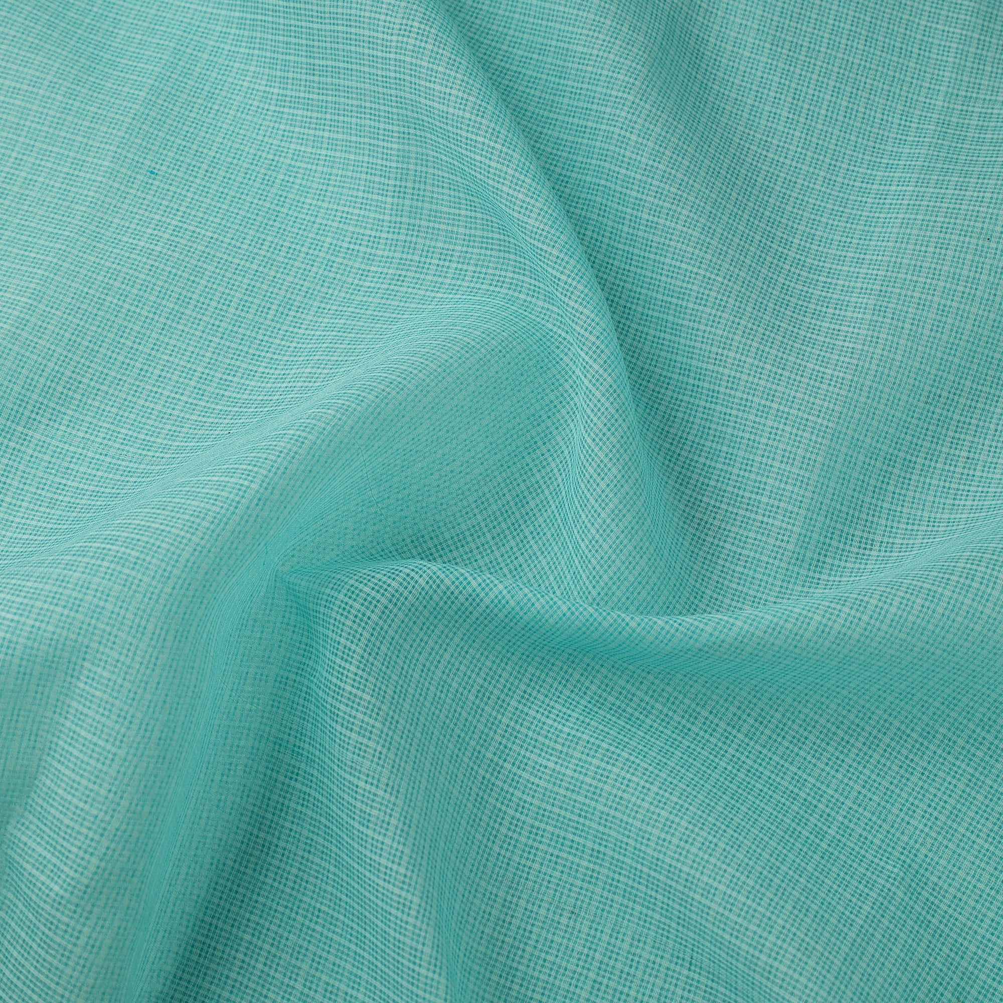 This green plain cotton kota doria fabric is crafted by artisans in Kota, Rajasthan. Known for its airy weave and lightweight texture, Kota Doria blends cotton and silk yarns, where the threads are finely interwoven to create check patterns. The use of natural colors enhances its authenticity. Ideal for making elegant kurtas, dupattas or sarees.