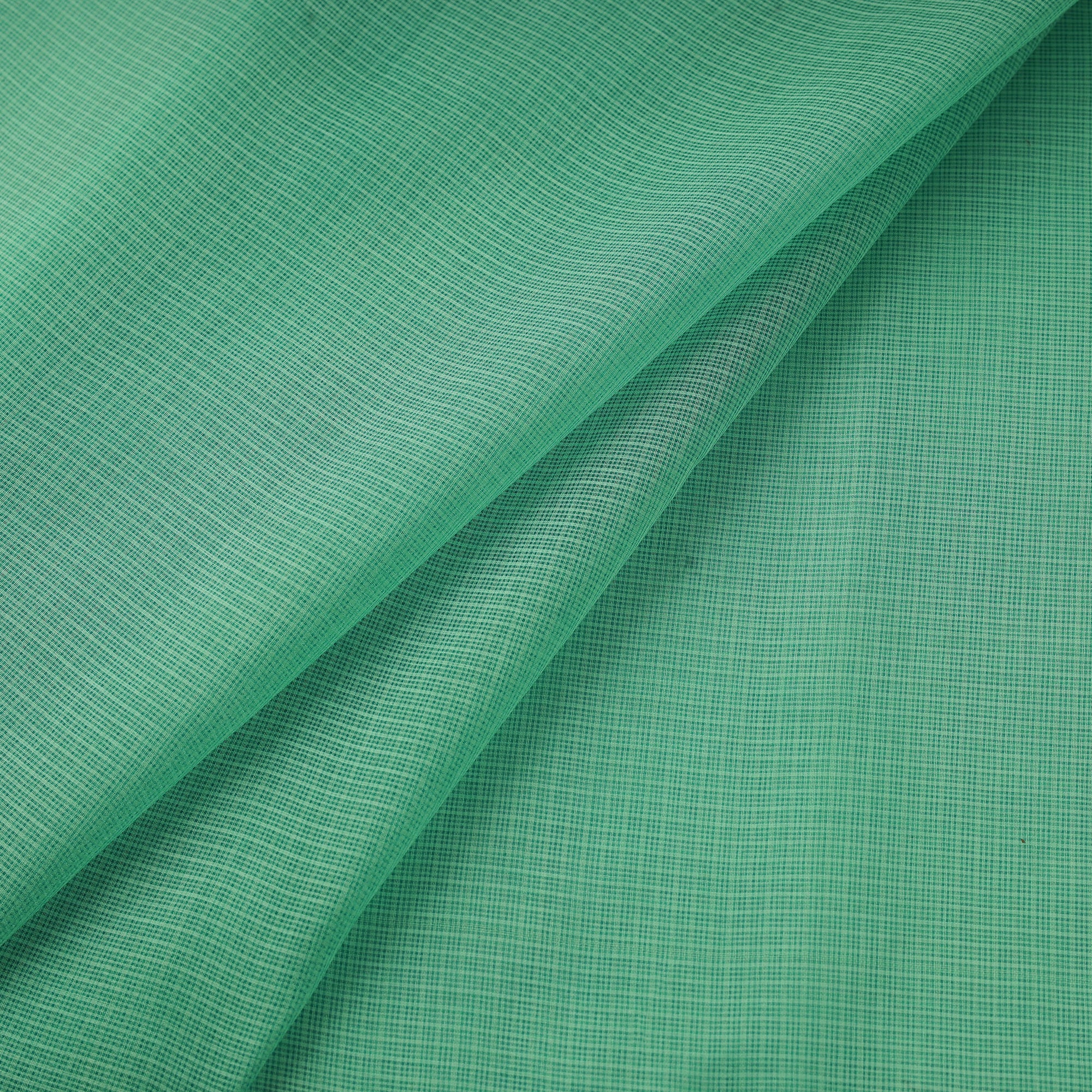 This green plain cotton kota doria fabric is crafted by artisans in Kota, Rajasthan. Known for its airy weave and lightweight texture, Kota Doria blends cotton and silk yarns, where the threads are finely interwoven to create check patterns. The use of natural colors enhances its authenticity. Ideal for making elegant kurtas, dupattas or sarees.