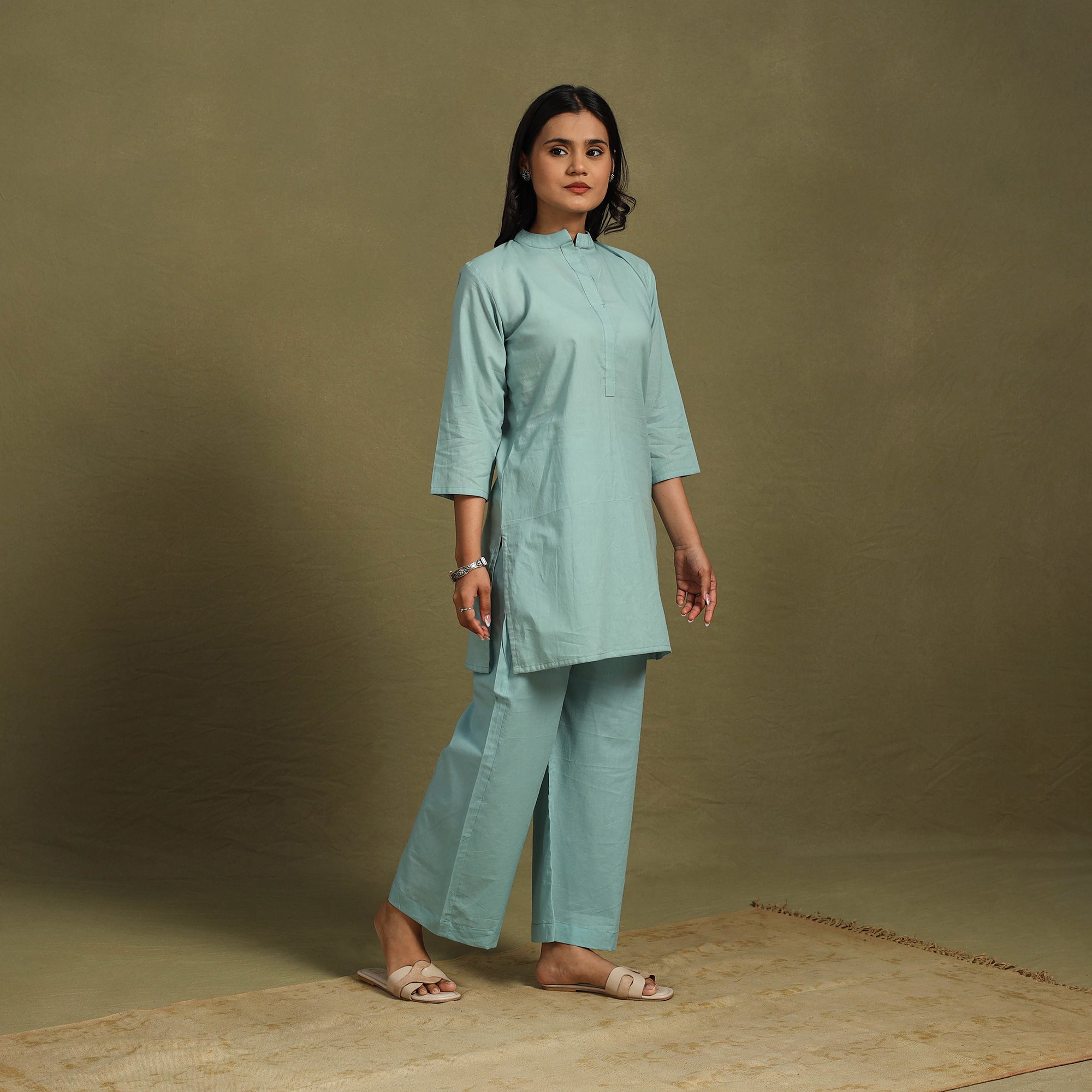 Stay stylish in this green top and palazzo co-ord set. Made from pre-washed, plain-dyed cotton fabric, the top features a relaxed fit that's comfortable to wear all day, while the elastic waistband and side pockets on the palazzo add practical ease for everyday use. Perfect for busy days, great for college, office, or simply lounging in style.