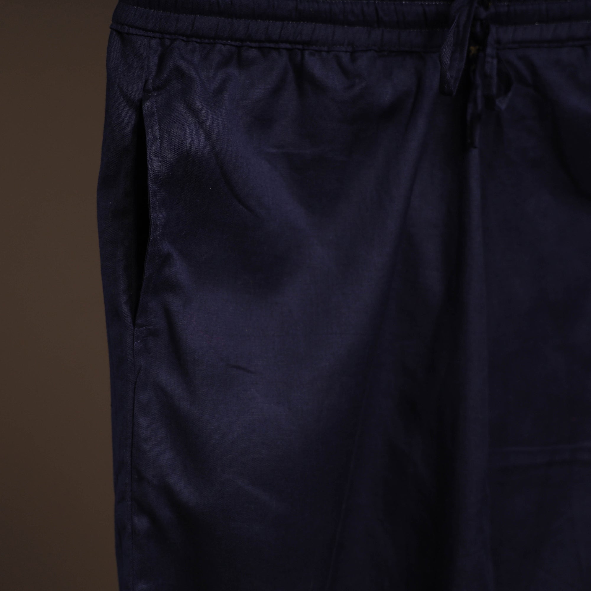 Stay stylish yet comfortable in this blue plain harem pant, crafted from pre-washed flex cotton for lasting softness and durability. Featuring an elastic waistband with drawstring, side pockets for convenience, and relaxed gathers that allow ease of movement, it ensures a perfect fit. A wardrobe essential, this harem pant combines comfort with modern style, making it ideal for yoga, travel, lounging, or casual outings.