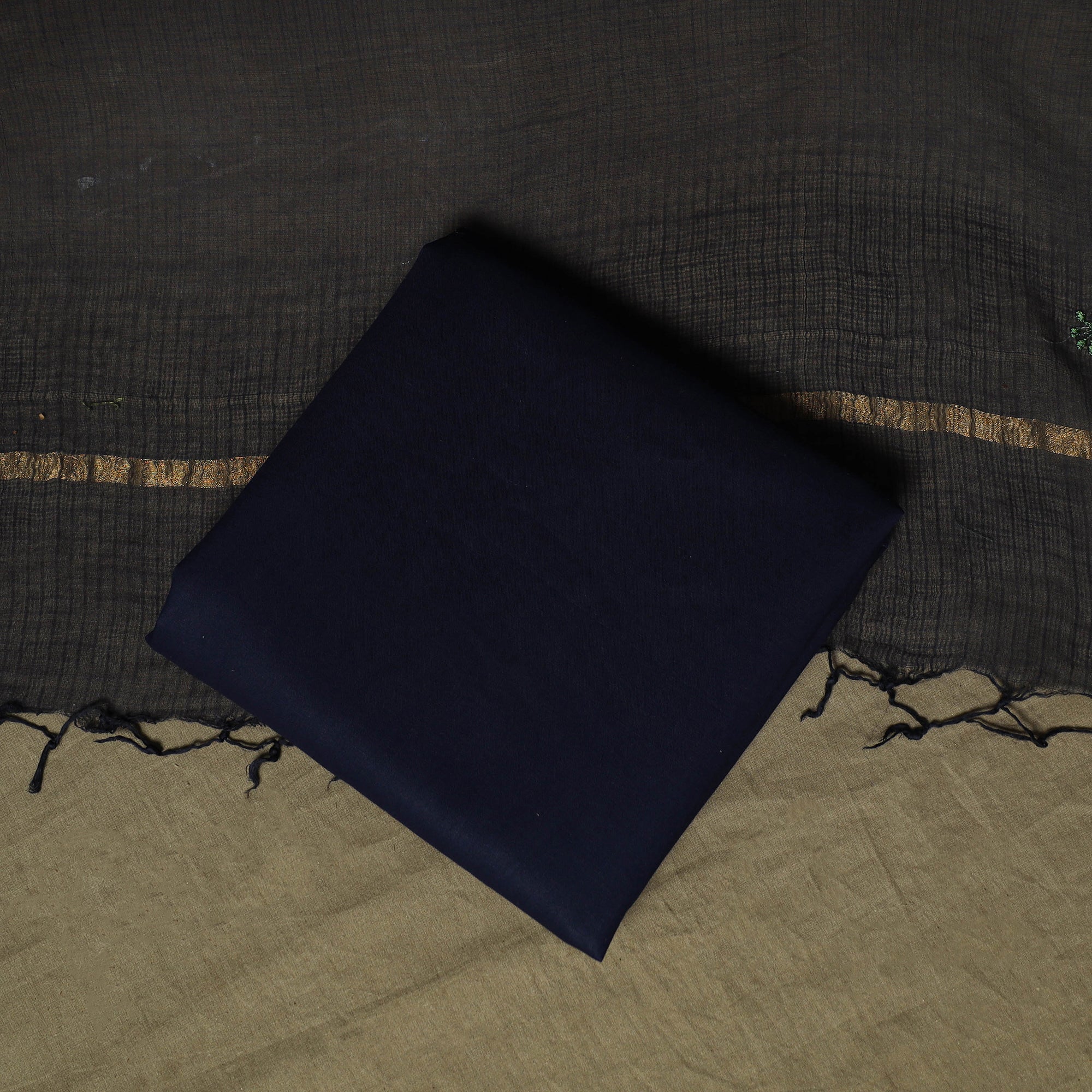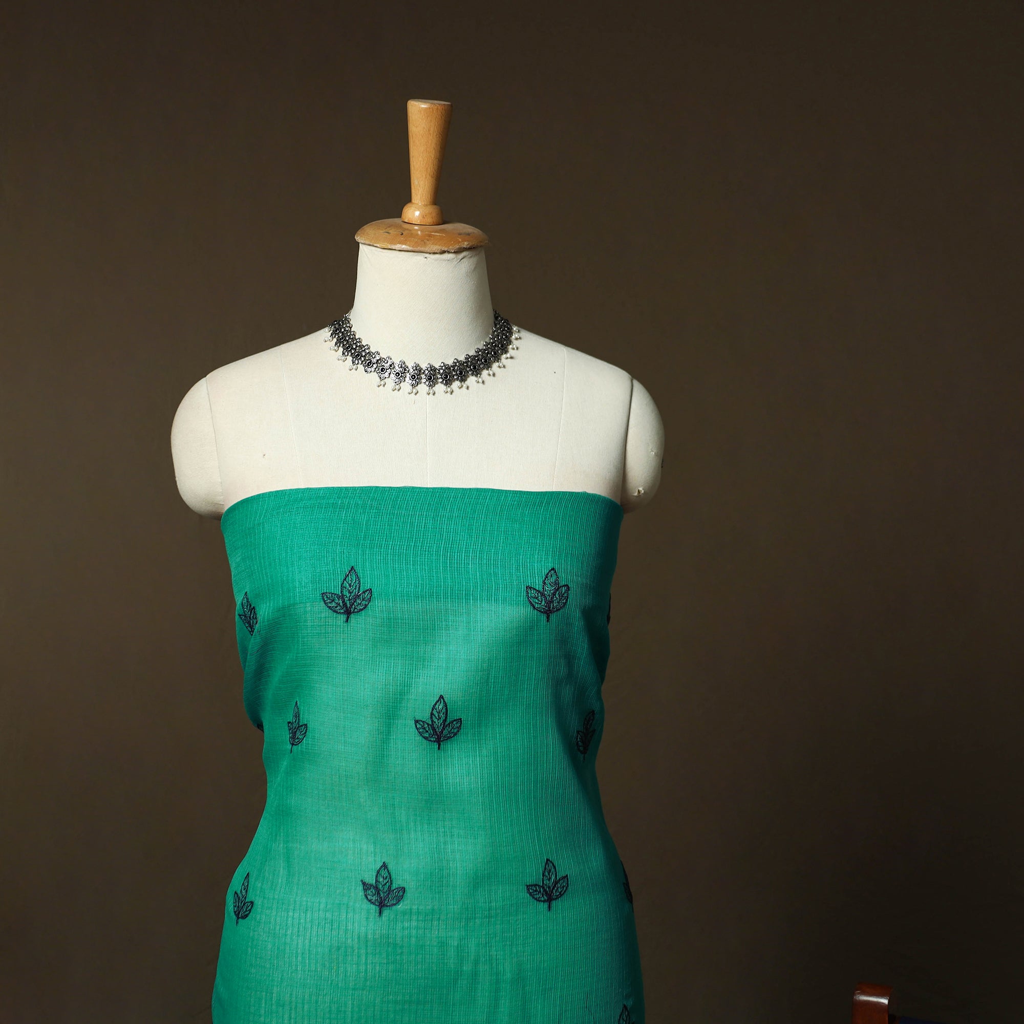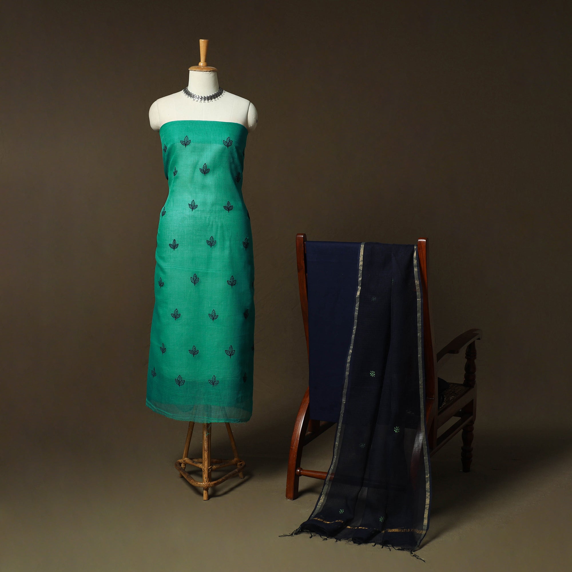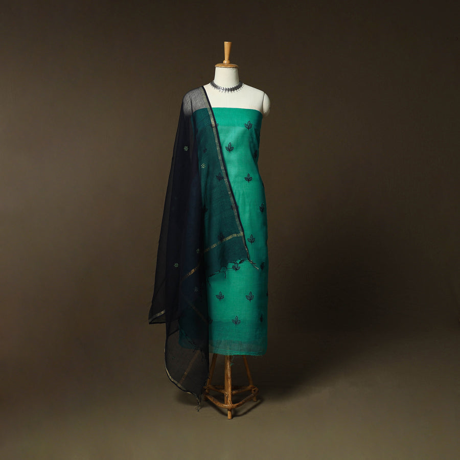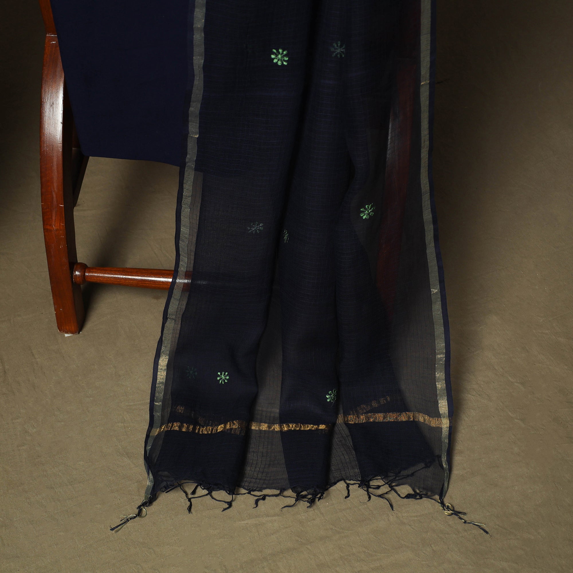 Plain kota doria cotton embroidered 3pc unstitched dress material suit set originates from Kota, Rajasthan, a region known for its traditional kota doria weaving. The set includes fabric for a kota doria kurta and dupatta, both featuring machine embroidery, along with a plain cotton bottom. Kota doria is an age-old Indian textile produced in the Kota district of Rajasthan, where fine threads are intricately interwoven to create its characteristic check patterns. This versatile dress material is suitable for festive occasions, family gatherings, casual outings, and even comfortable daily wear.