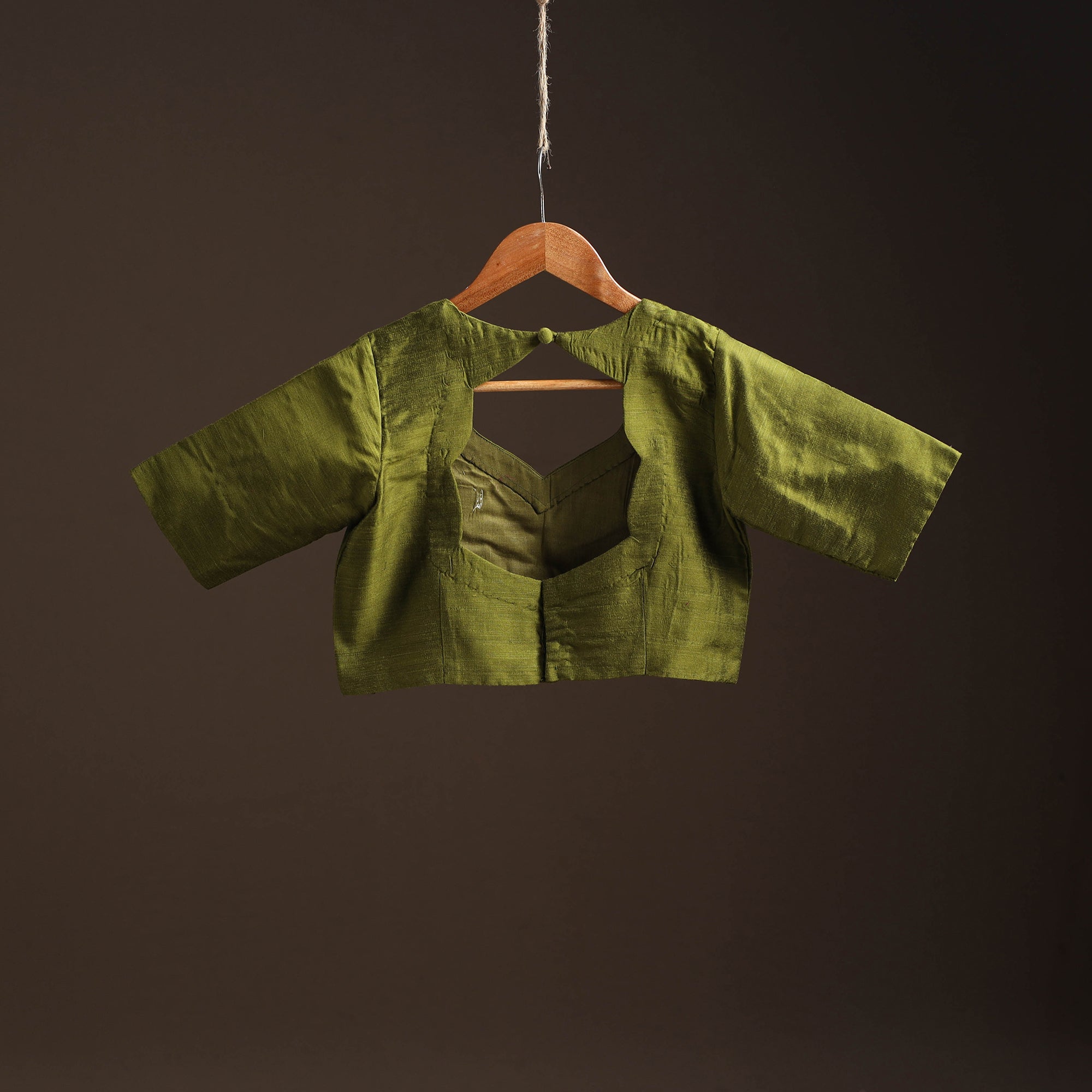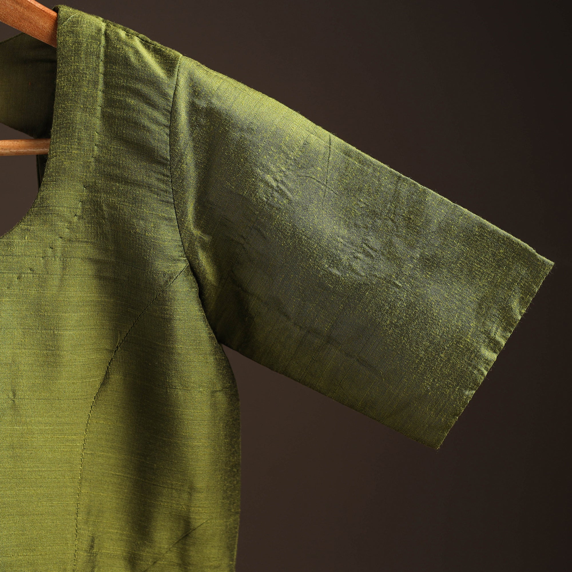 This green plain readymade blouse features a half sleeves with a front hook closure for easy wear. Made from slub silk fabric, it gives a graceful look and pairs beautifully with sarees or skirts, making it ideal for both everyday wear and special occasions.