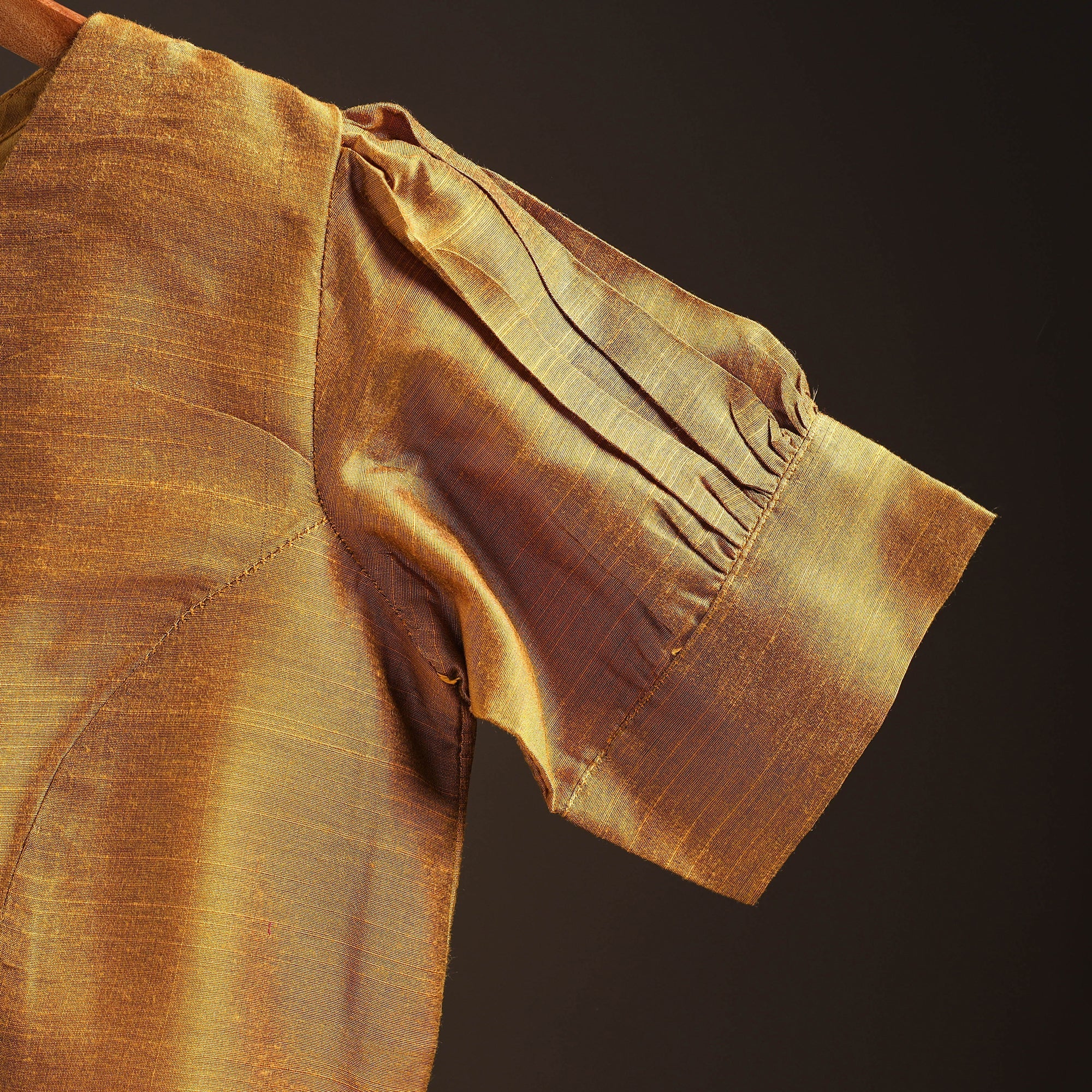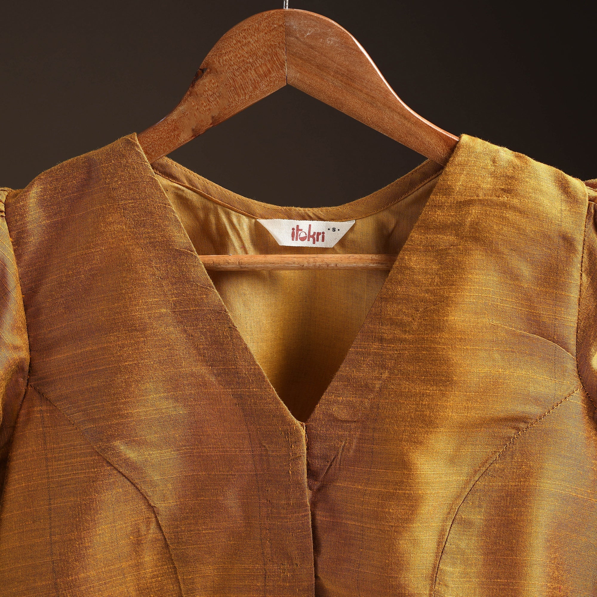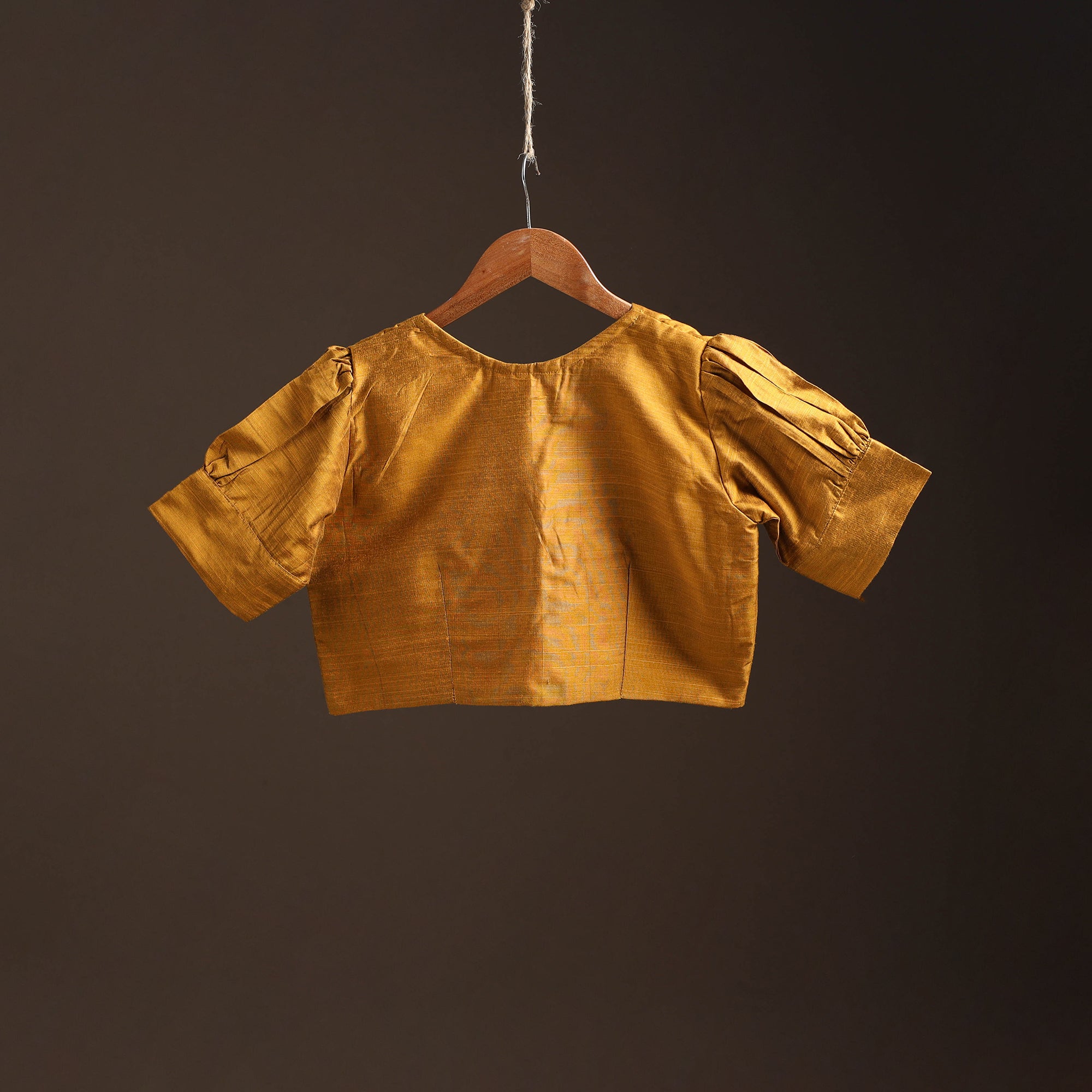 This yellow plain readymade blouse features a half sleeves with a front hook closure for easy wear. Made from slub silk fabric, it gives a graceful look and pairs beautifully with sarees or skirts, making it ideal for both everyday wear and special occasions.