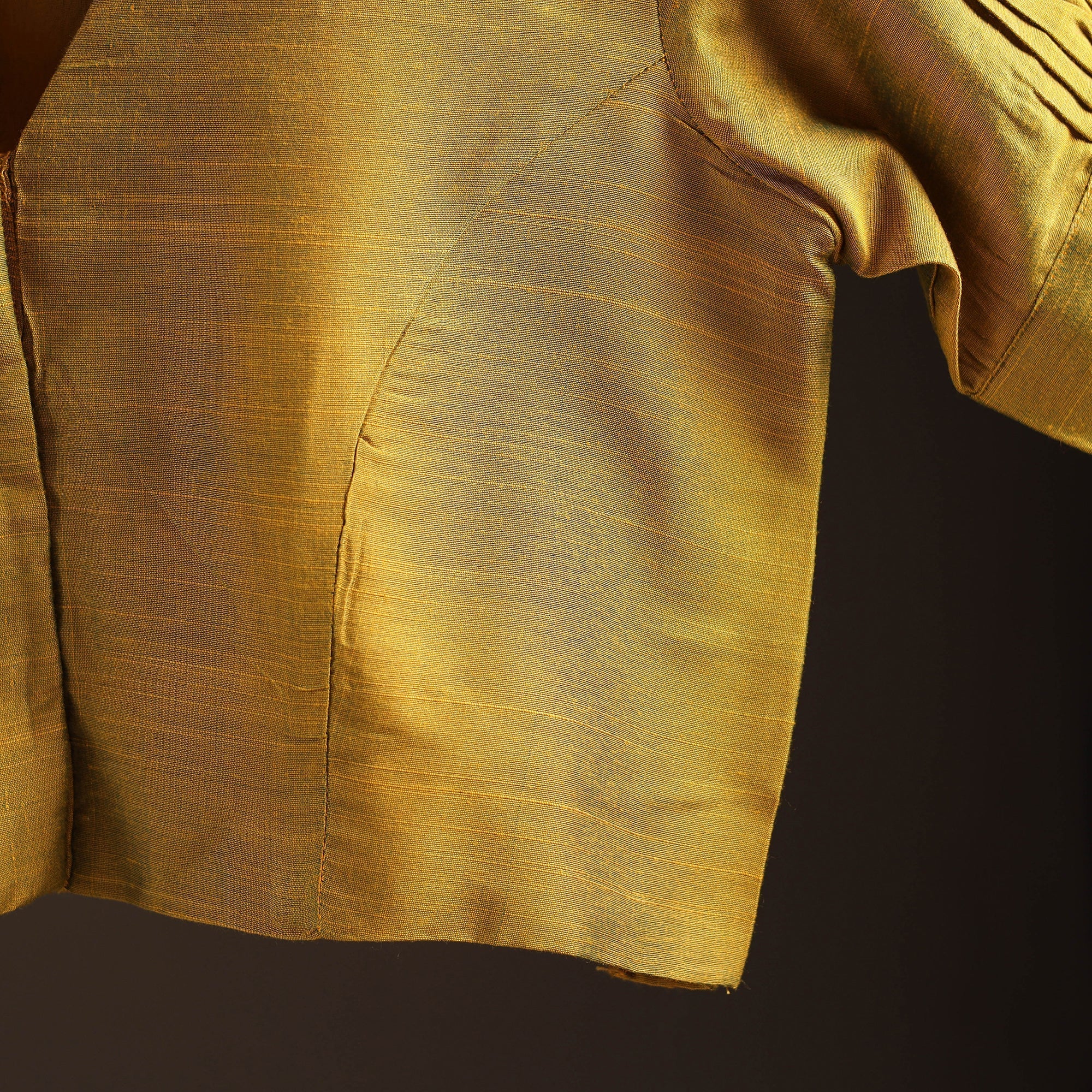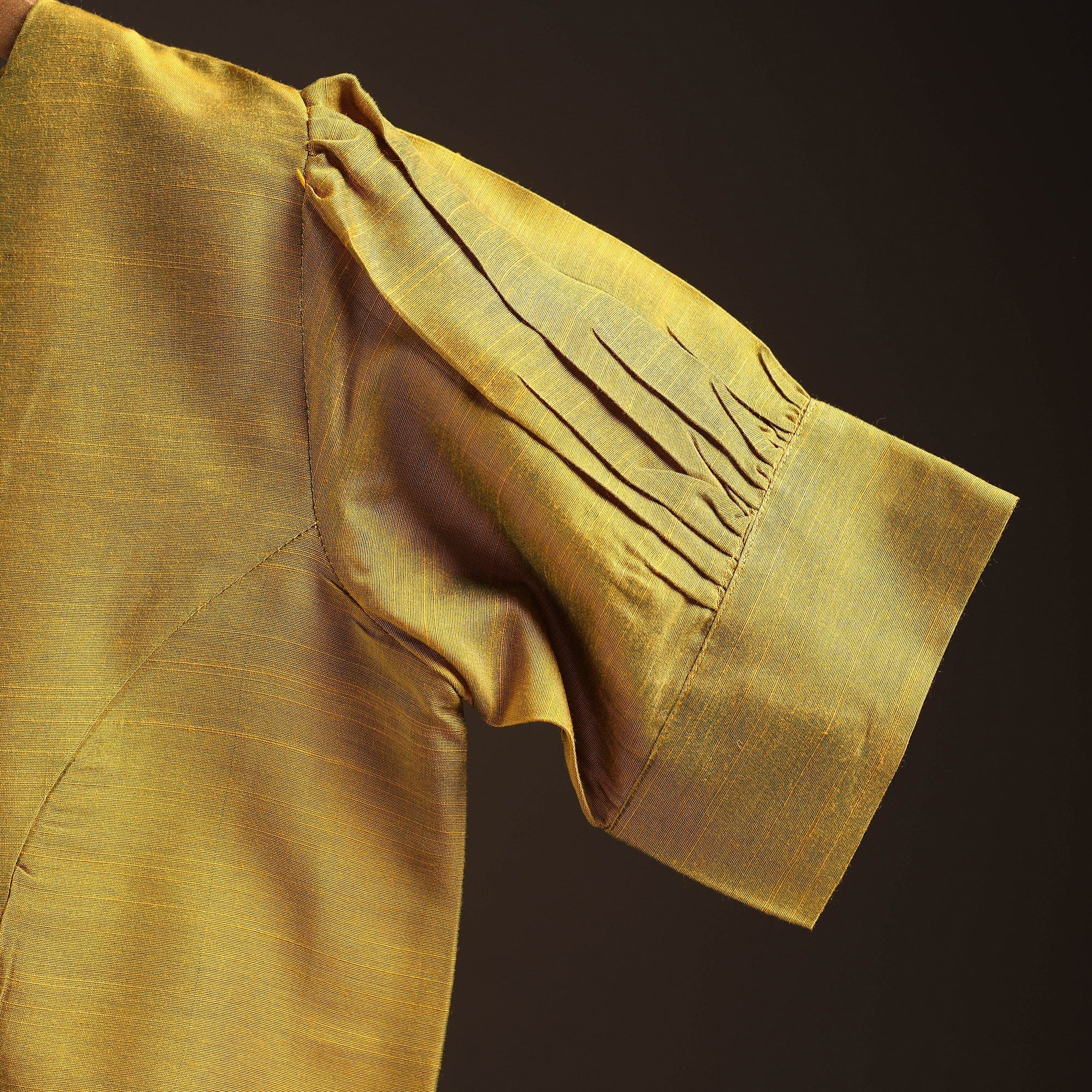 This yellow plain readymade blouse features a half sleeves with a front hook closure for easy wear. Made from slub silk fabric, it gives a graceful look and pairs beautifully with sarees or skirts, making it ideal for both everyday wear and special occasions.