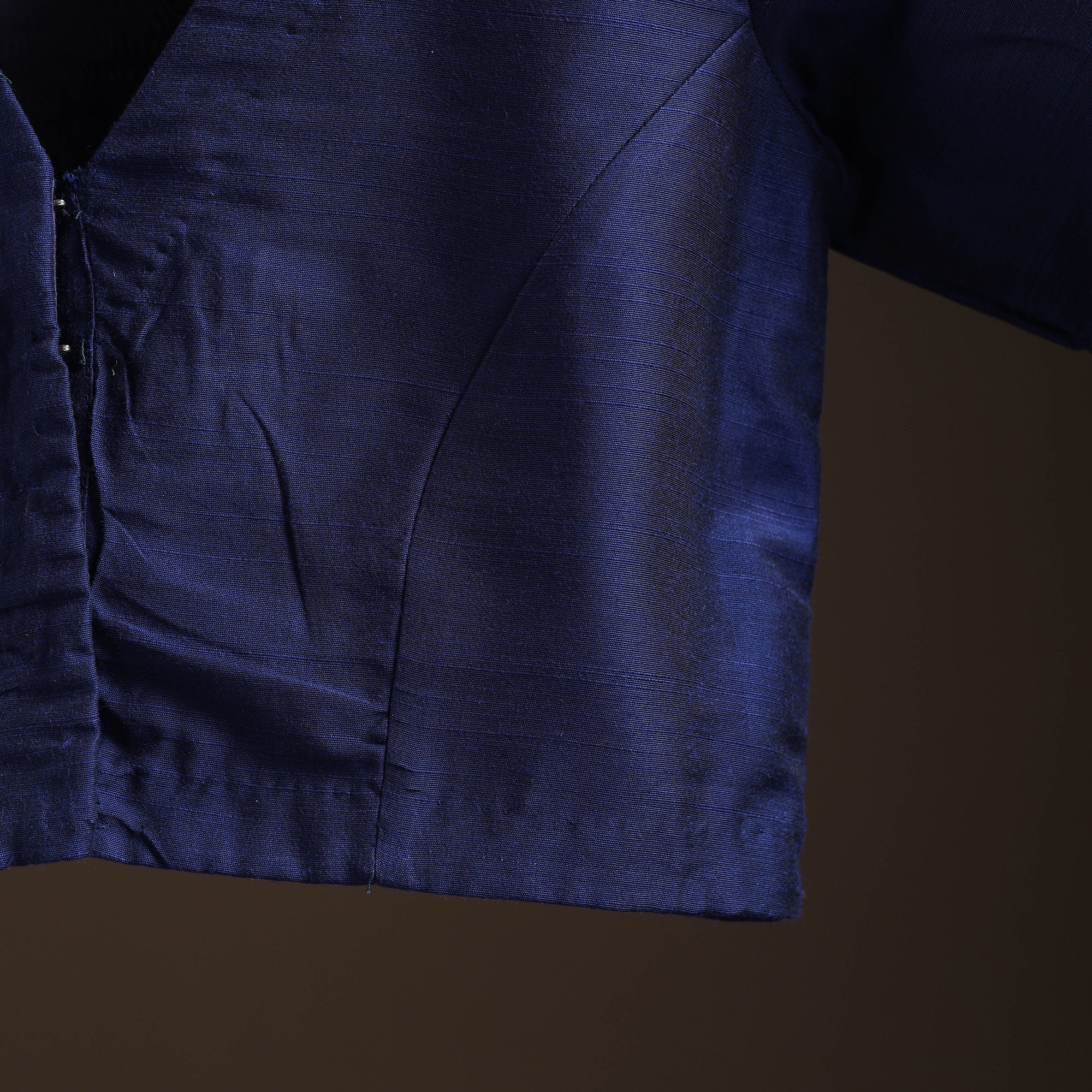 This blue plain readymade blouse features a half sleeves with a front hook closure for easy wear. Made from slub silk fabric, it gives a graceful look and pairs beautifully with sarees or skirts, making it ideal for both everyday wear and special occasions.
