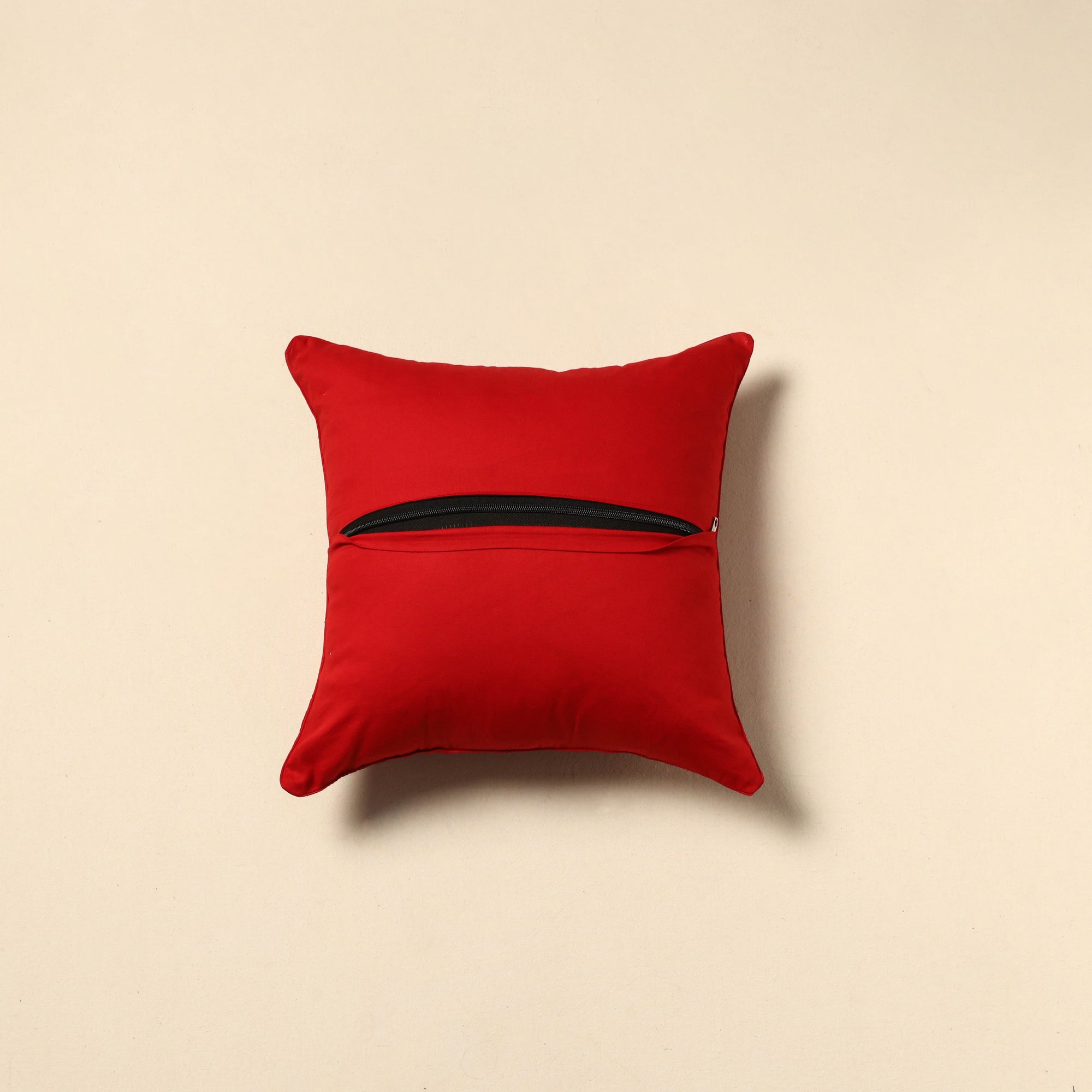 | Material | Red plain zari buti cushion cover, crafted from a blend of spun dupion viscose silk and polyester fibers. It blends artistry with comfort, making it perfect for your sofa, bed or lounge area. |