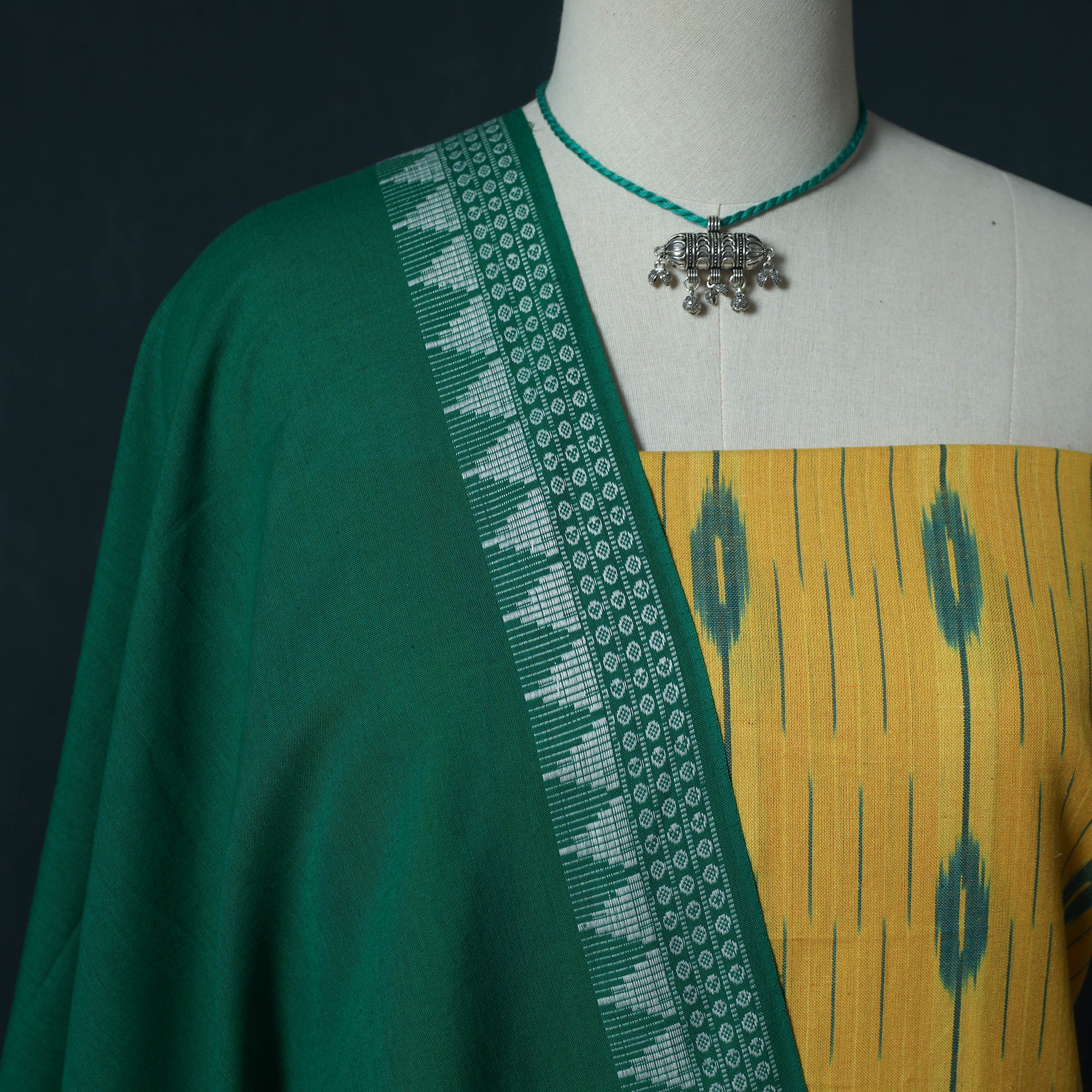 Pochampally ikat cotton 2pc dress material with sambalpuri plain dupatta and matching jewellery.