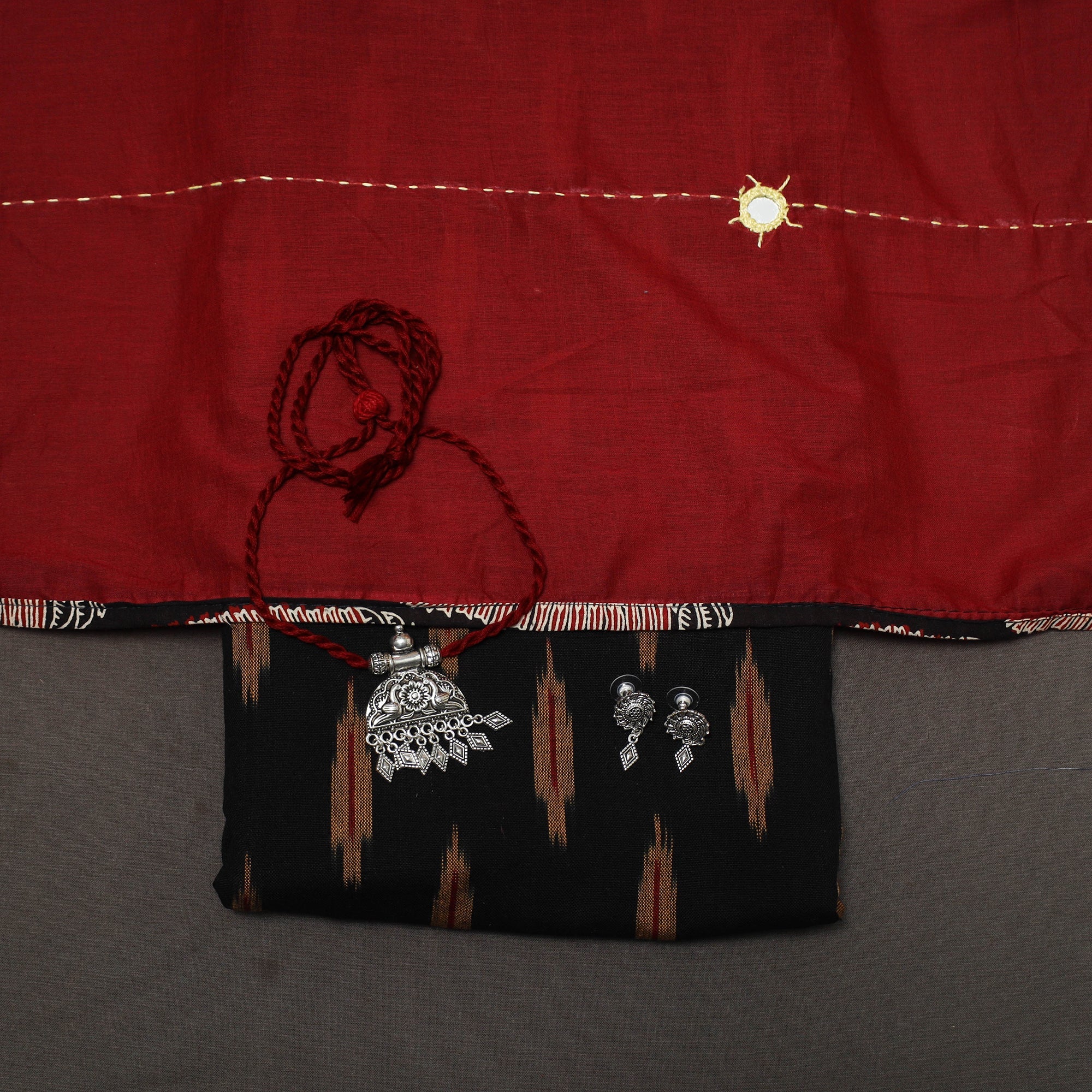 2pc unstitched dress material set features a pochampally ikat cotton kurta fabric, perfect for everyday elegance. It comes paired with a cotton ajrakh applique work tagai dupatta that adds soft texture and grace. Completing the set is a handcrafted necklace with matching earrings, making it a ready-to-style ensemble for effortless ethnic wear.