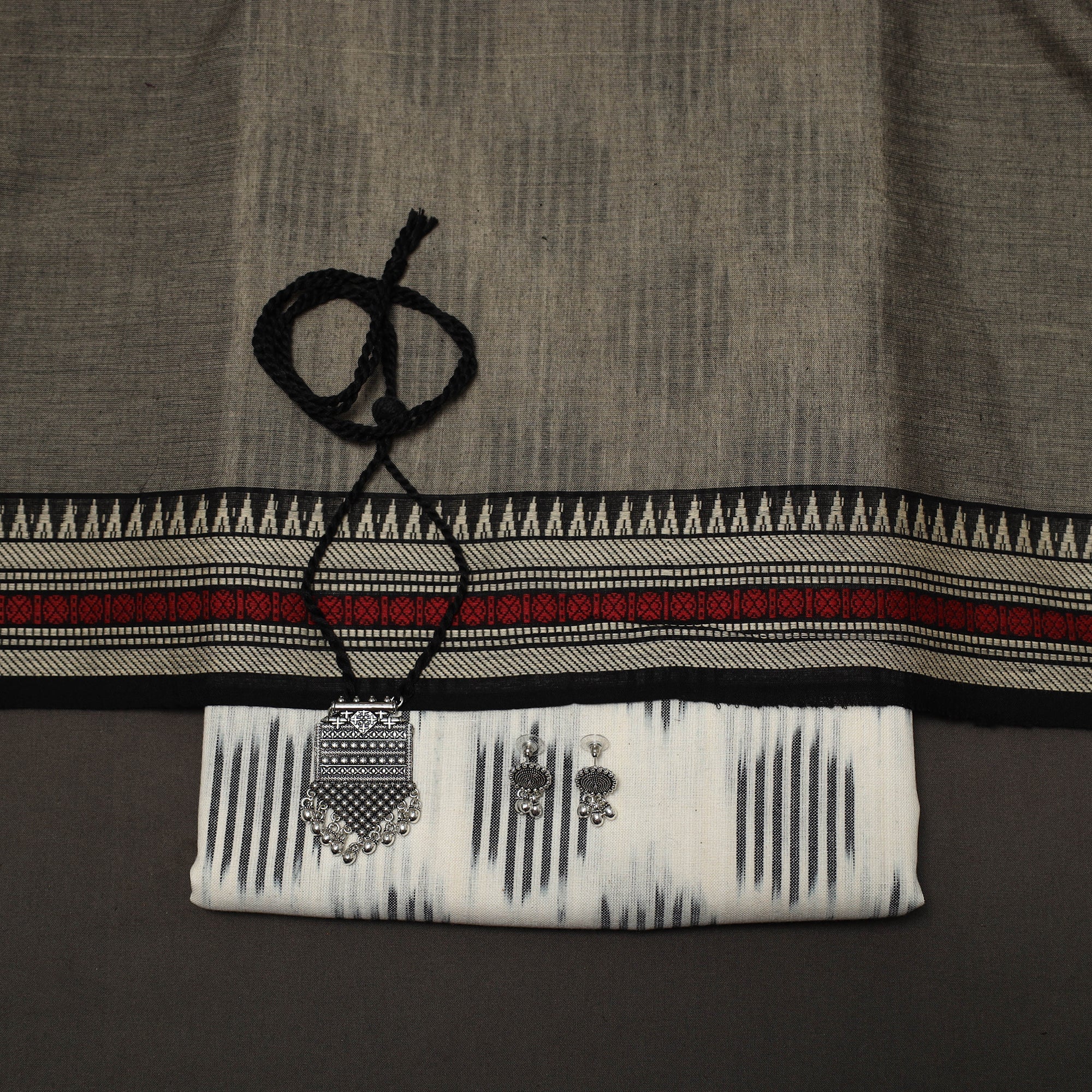 Pure cotton 2pc unstitched dress material set features pochampally ikat woven kurta fabric where the threads are dyed before weaving to create patterns. It is paired with dharwad dupatta. The set also includes a handcrafted necklace and matching earrings.