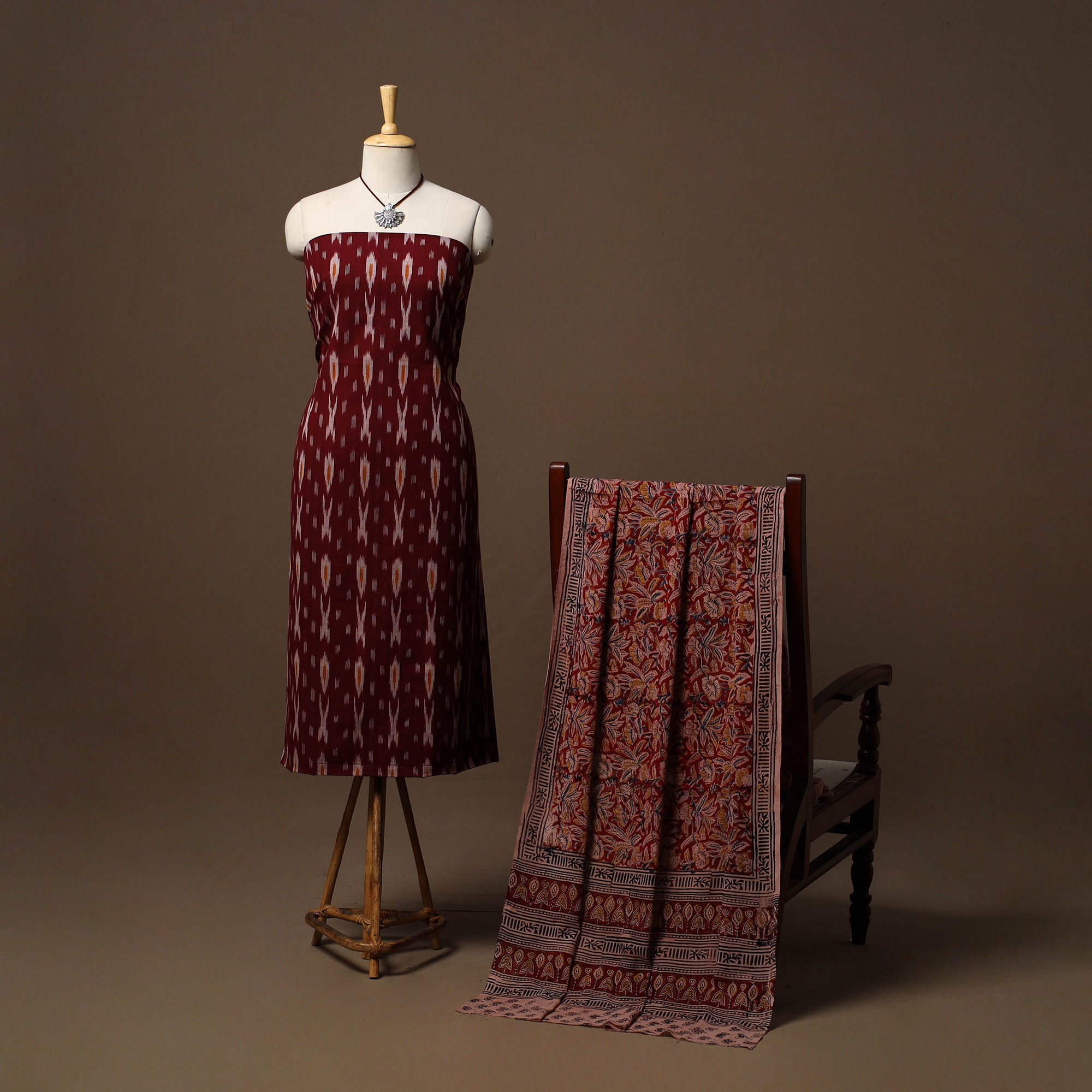 Pure cotton 2pc unstitched dress material set features pochampally ikat woven kurta fabric where the threads are dyed before weaving to create patterns. It is paired with kalamkari printed dupatta. The set also includes a handcrafted necklace and matching earrings.