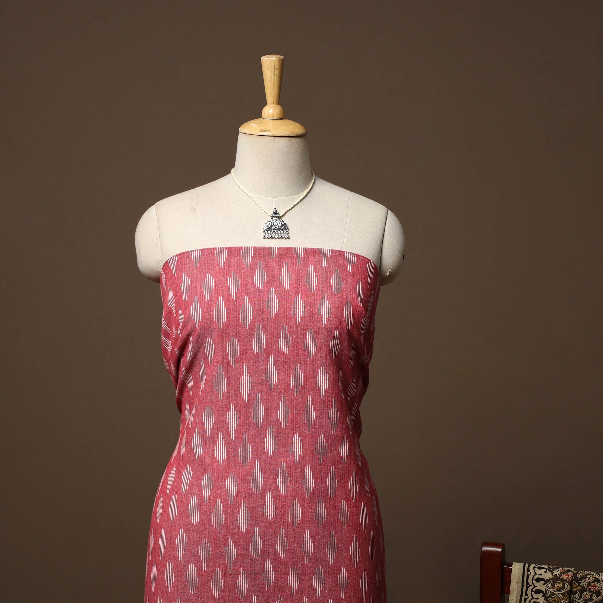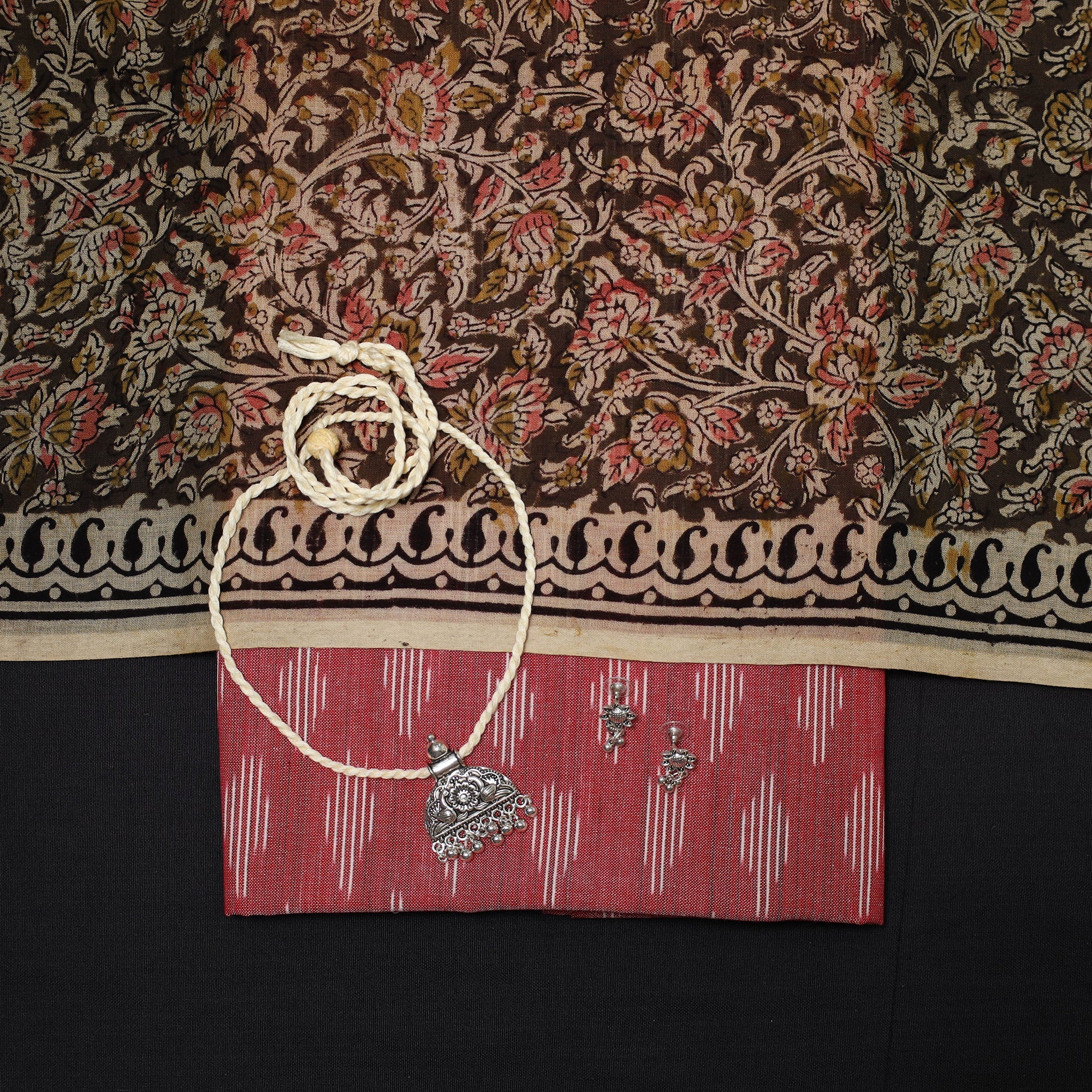 Pure cotton 2pc unstitched dress material set features pochampally ikat woven kurta fabric where the threads are dyed before weaving to create patterns. It is paired with kalamkari printed dupatta. The set also includes a handcrafted necklace and matching earrings.