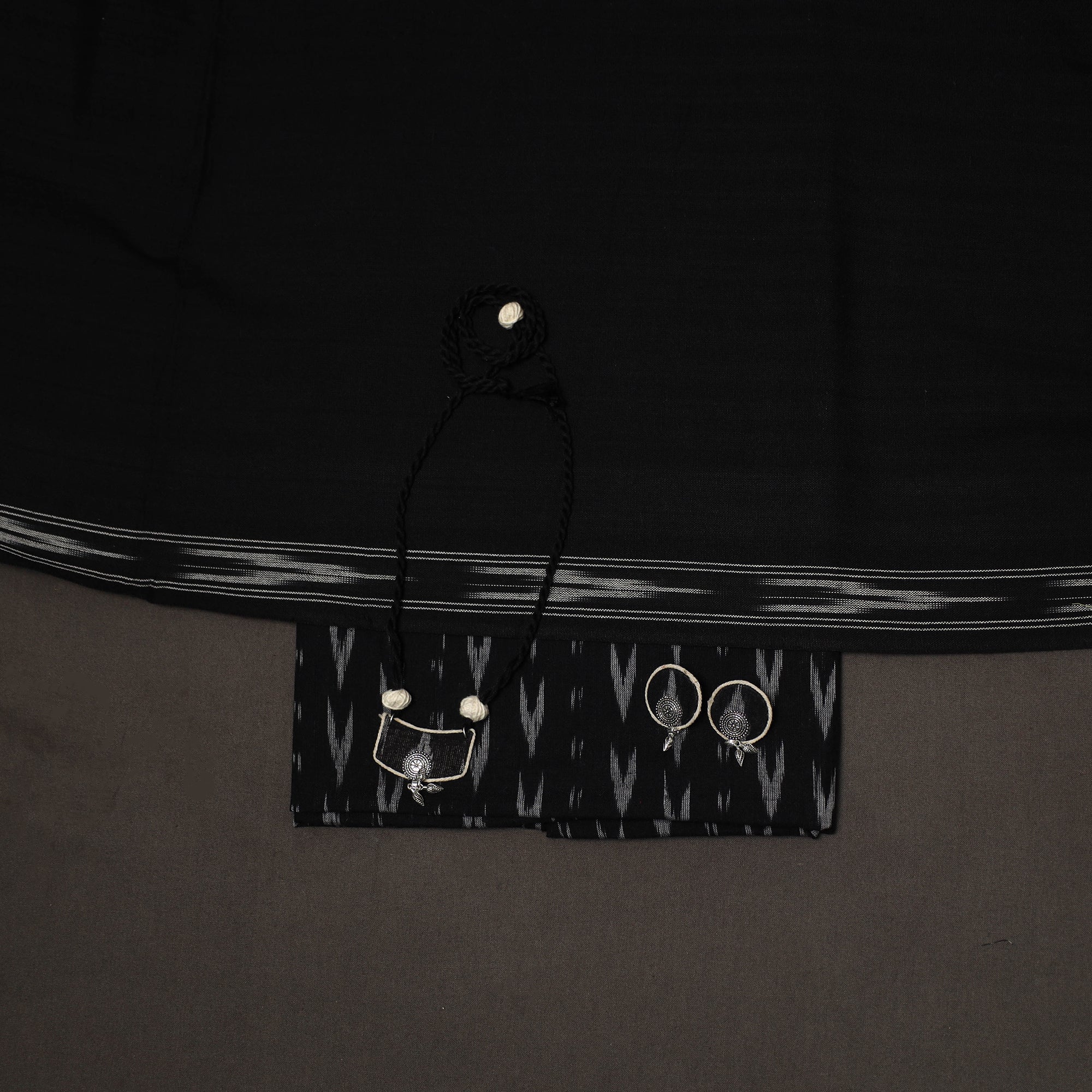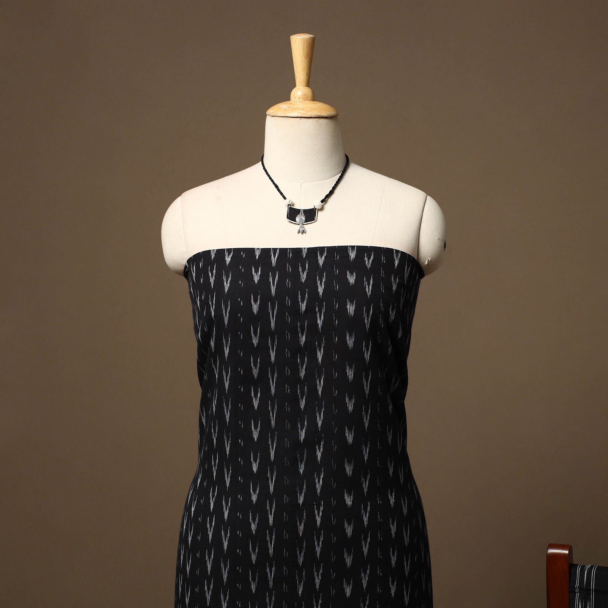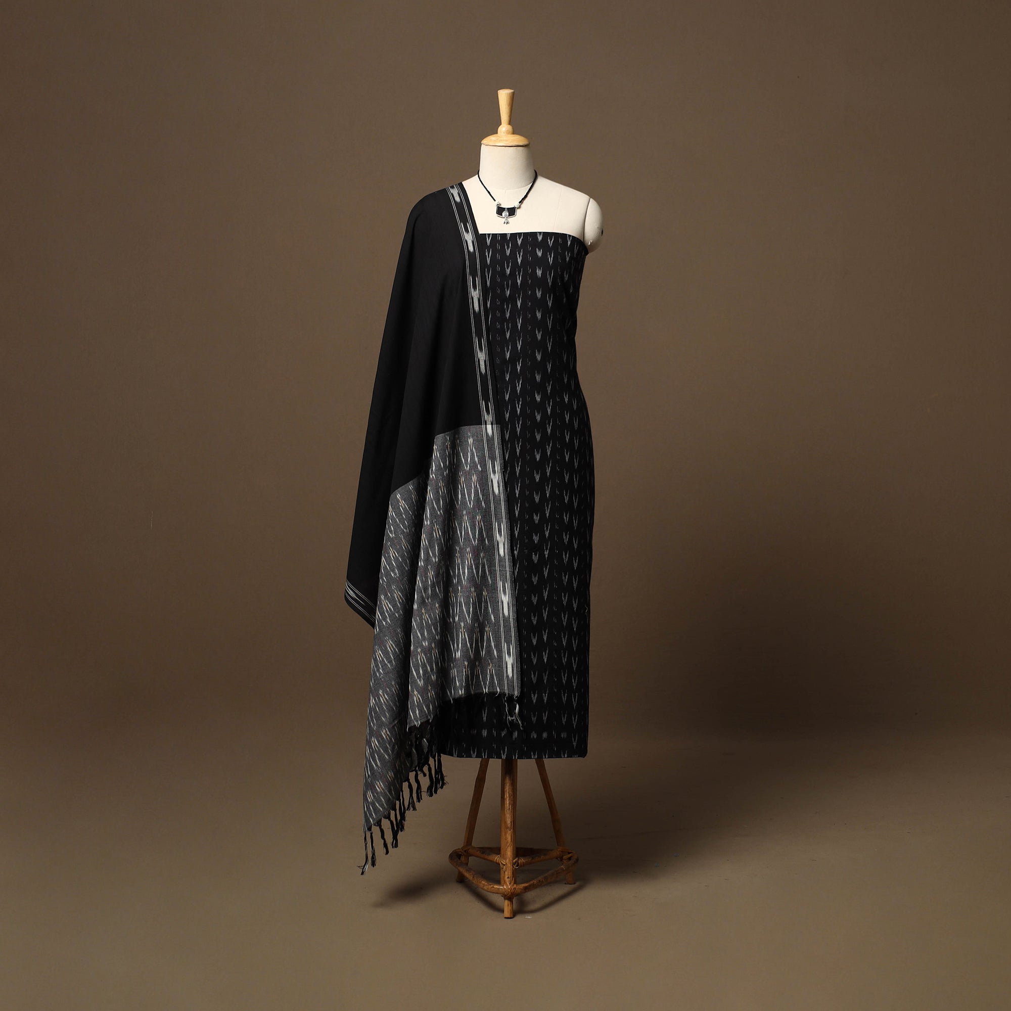 This 2pc unstitched dress material set features a pochampally ikat cotton kurta fabric, perfect for everyday elegance. It is paired with a matching pochampally ikat dupatta that adds soft texture and visual balance to the set. Completing the ensemble is a handcrafted necklace with matching earrings, making it a ready-to-style choice for effortless ethnic wear.