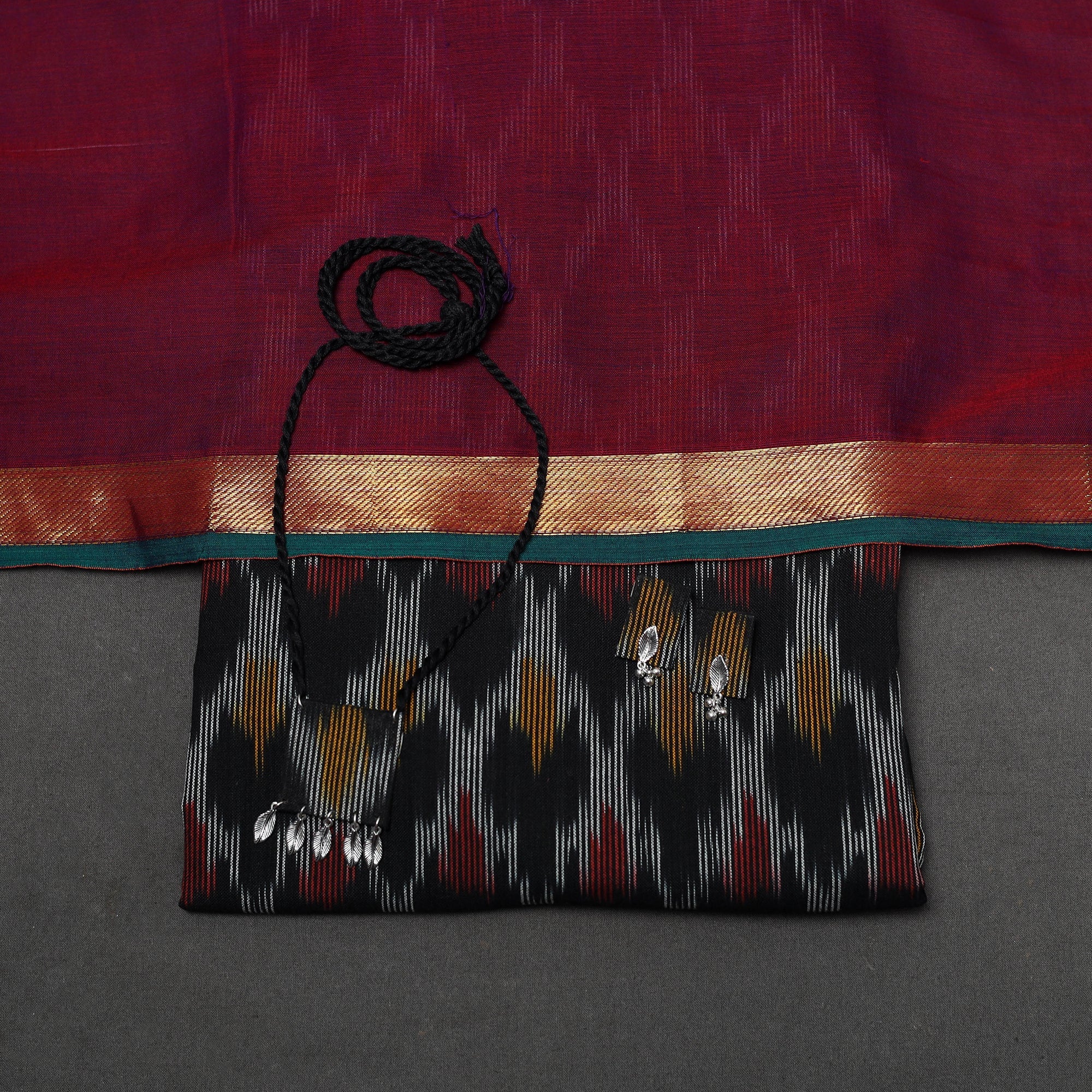 Black 2pc cotton unstitched dress material set features a pochampally ikat woven kurta fabric made by artisans from Telangana, where the threads are dyed before weaving. It is paired with a dharwad-woven border dupatta. The set also includes a handcrafted necklace and matching earrings, making it perfect for festive events, family gatherings, special occasions or even as a thoughtful gift.