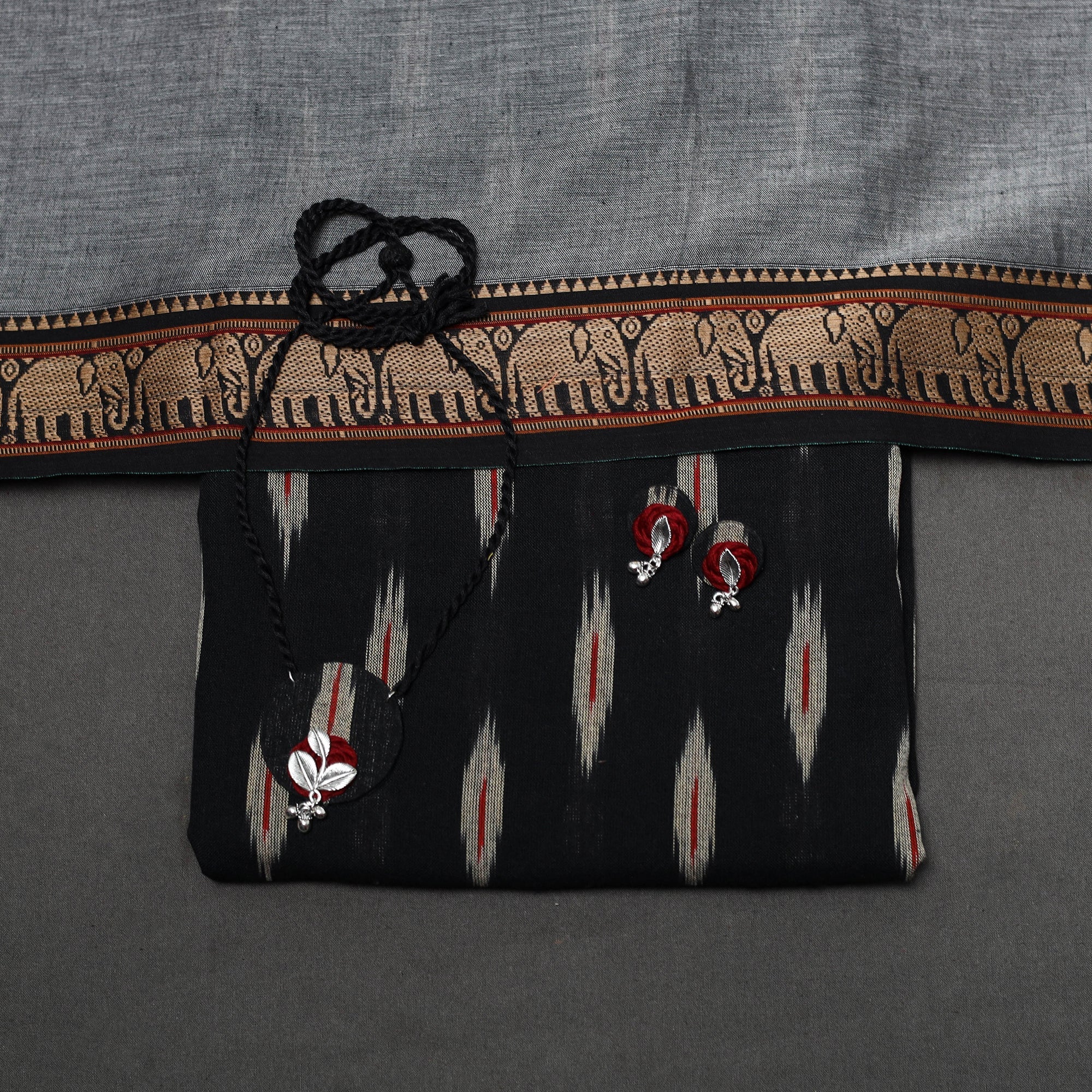 Black 2pc cotton unstitched dress material set features a pochampally ikat woven kurta fabric made by artisans from Telangana, where the threads are dyed before weaving. It is paired with a dharwad-woven border dupatta. The set also includes a handcrafted necklace and matching earrings, making it perfect for festive events, family gatherings, special occasions or even as a thoughtful gift.