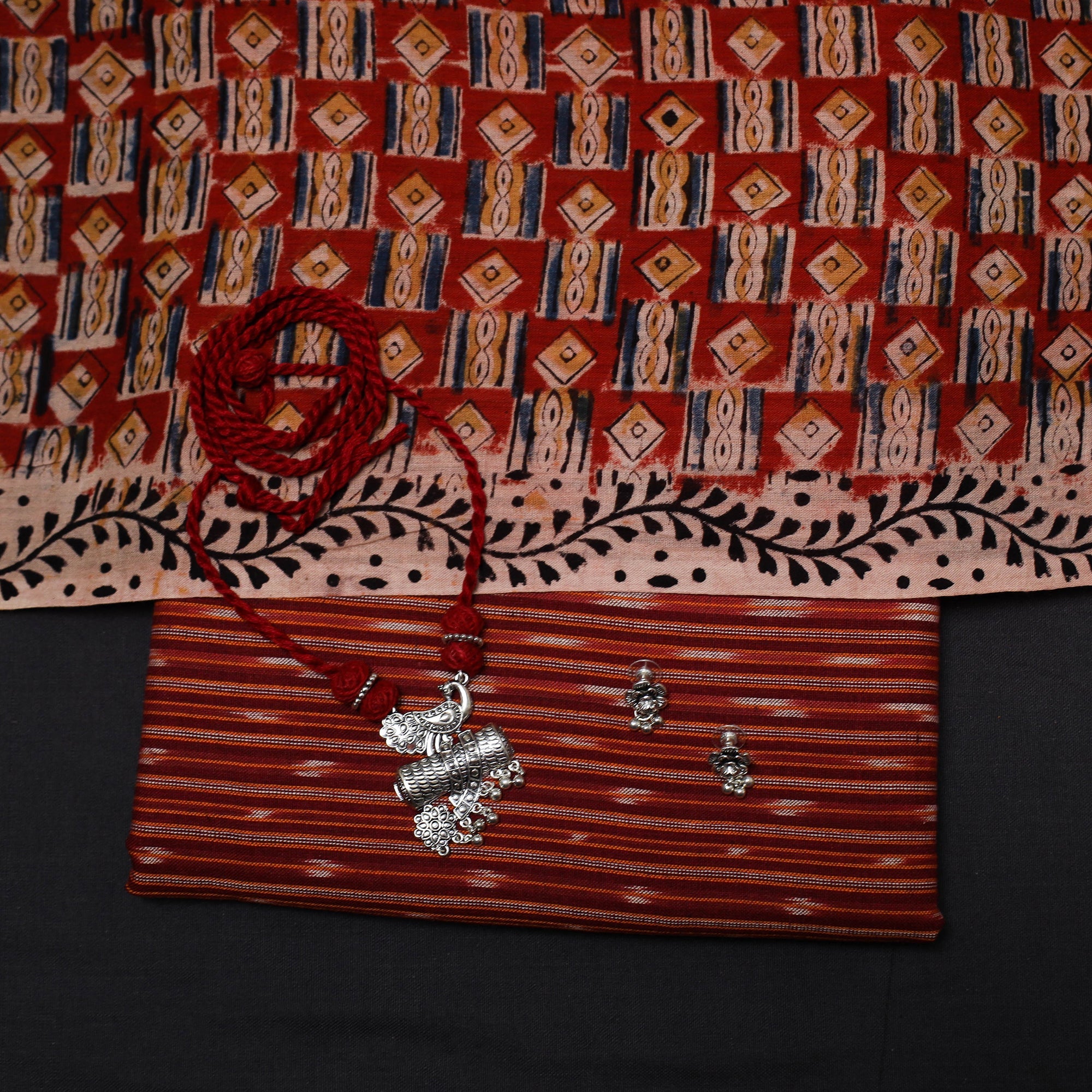 Pure cotton 2pc unstitched dress material set features pochampally ikat woven kurta fabric where the threads are dyed before weaving to create patterns. It is paired with kalamkari printed dupatta. The set also includes a handcrafted necklace and matching earrings.