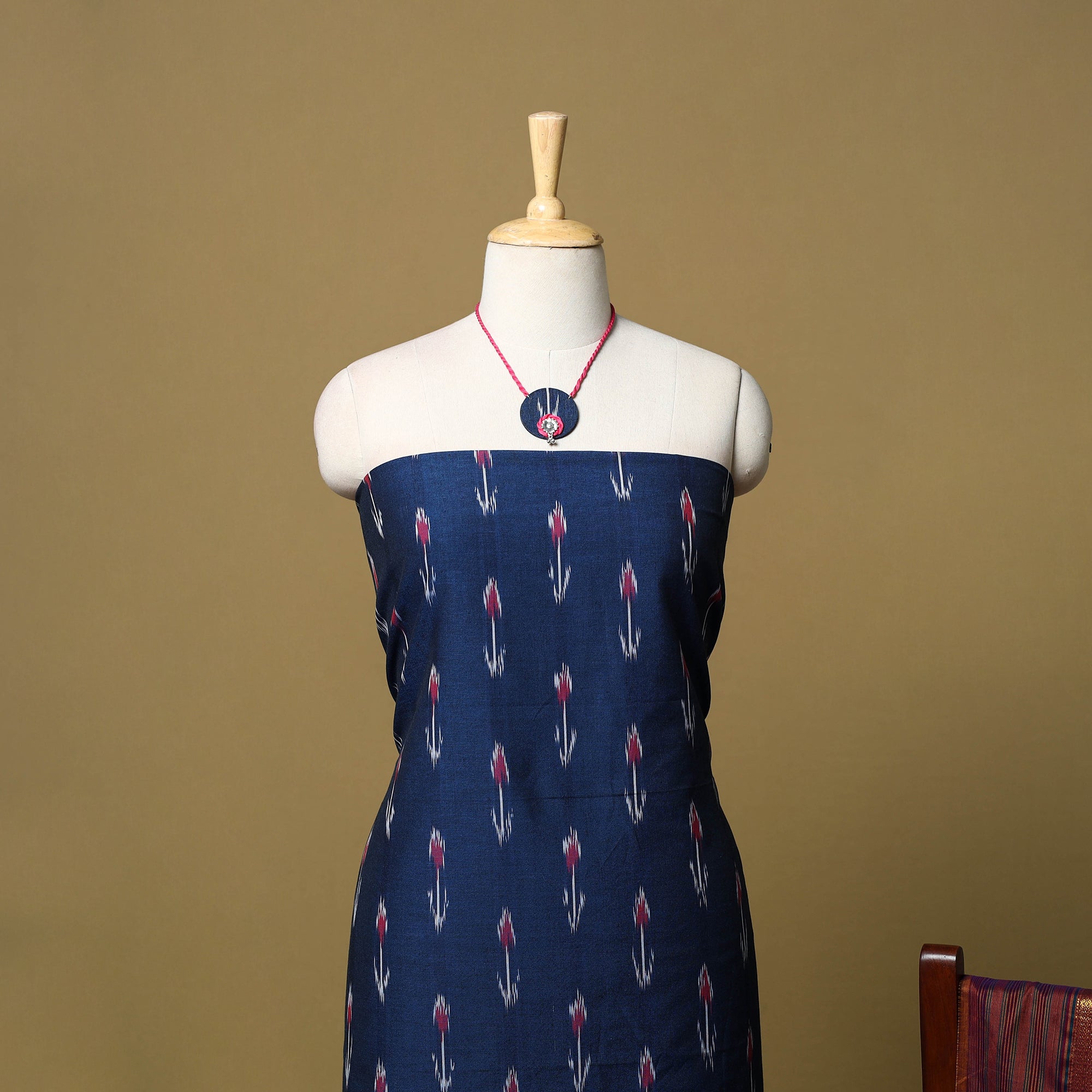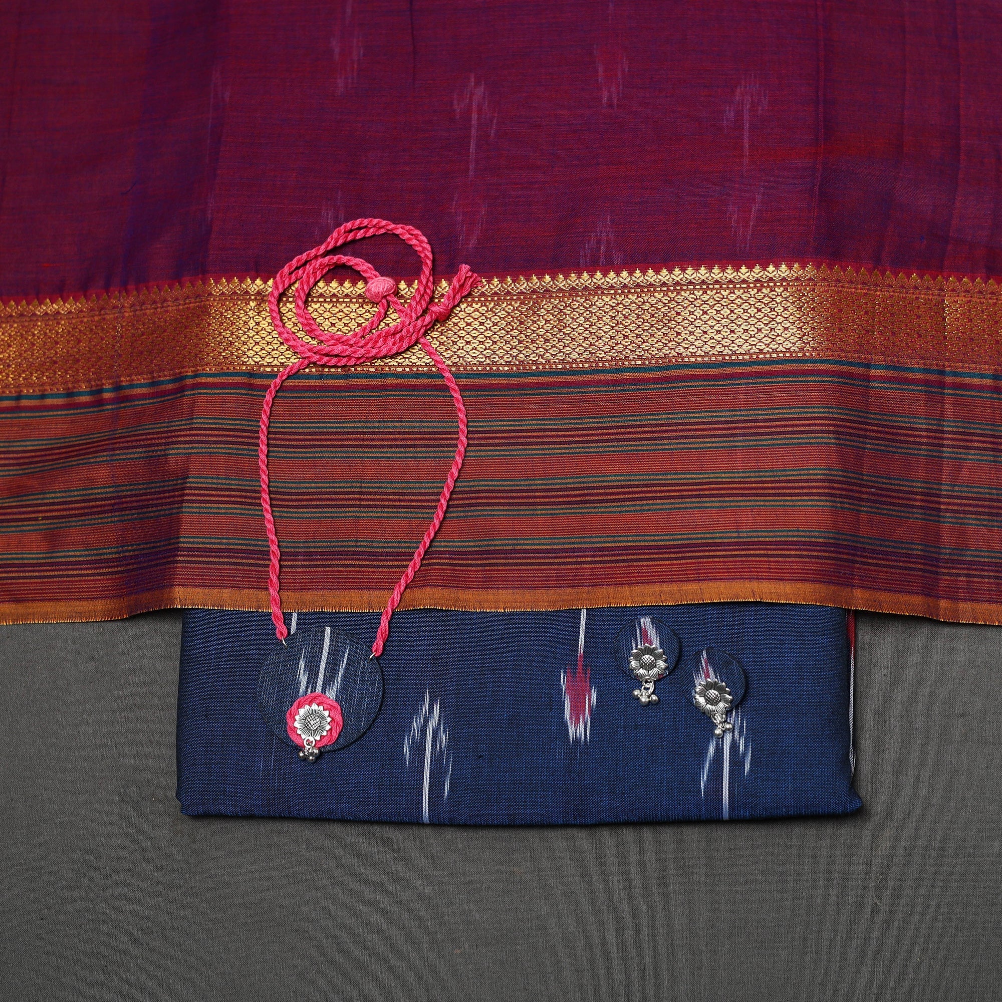 Blue 2pc cotton unstitched dress material set features a pochampally ikat woven kurta fabric made by artisans from Telangana, where the threads are dyed before weaving. It is paired with a dharwad-woven border dupatta. The set also includes a handcrafted necklace and matching earrings, making it perfect for festive events, family gatherings, special occasions or even as a thoughtful gift.