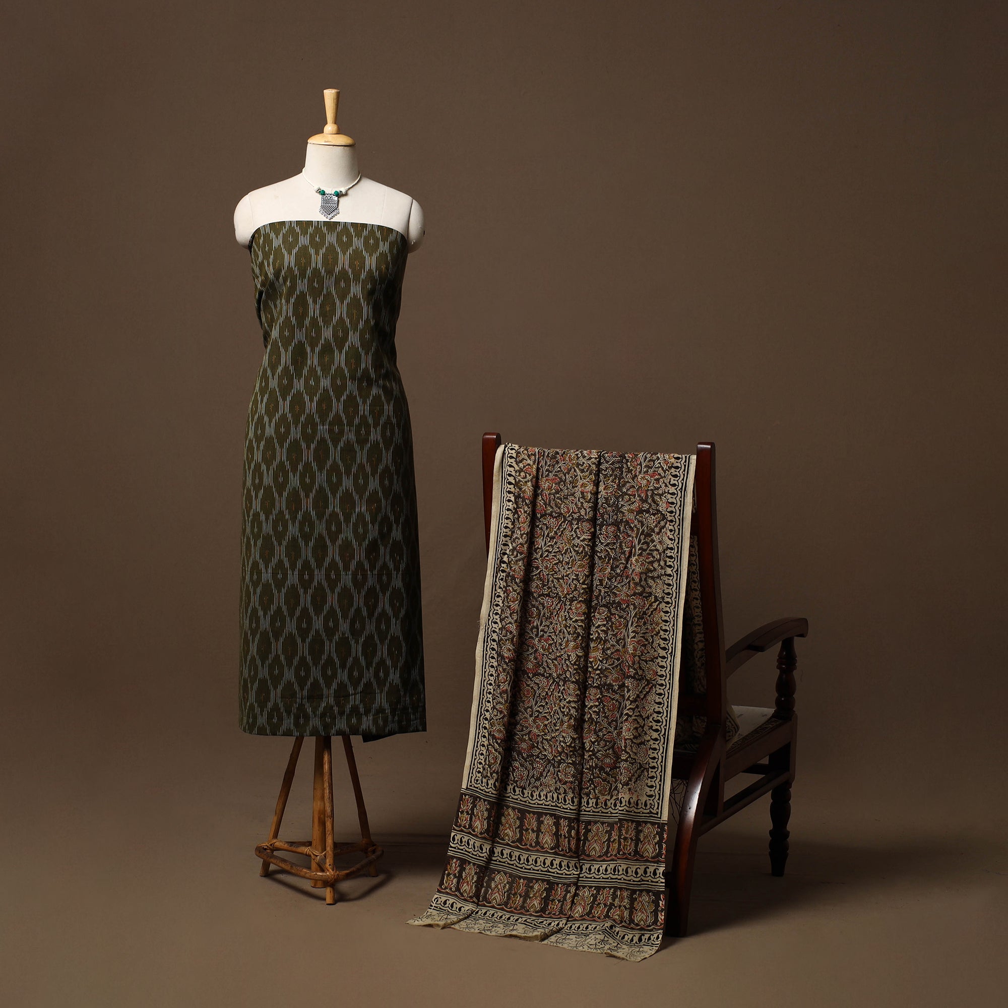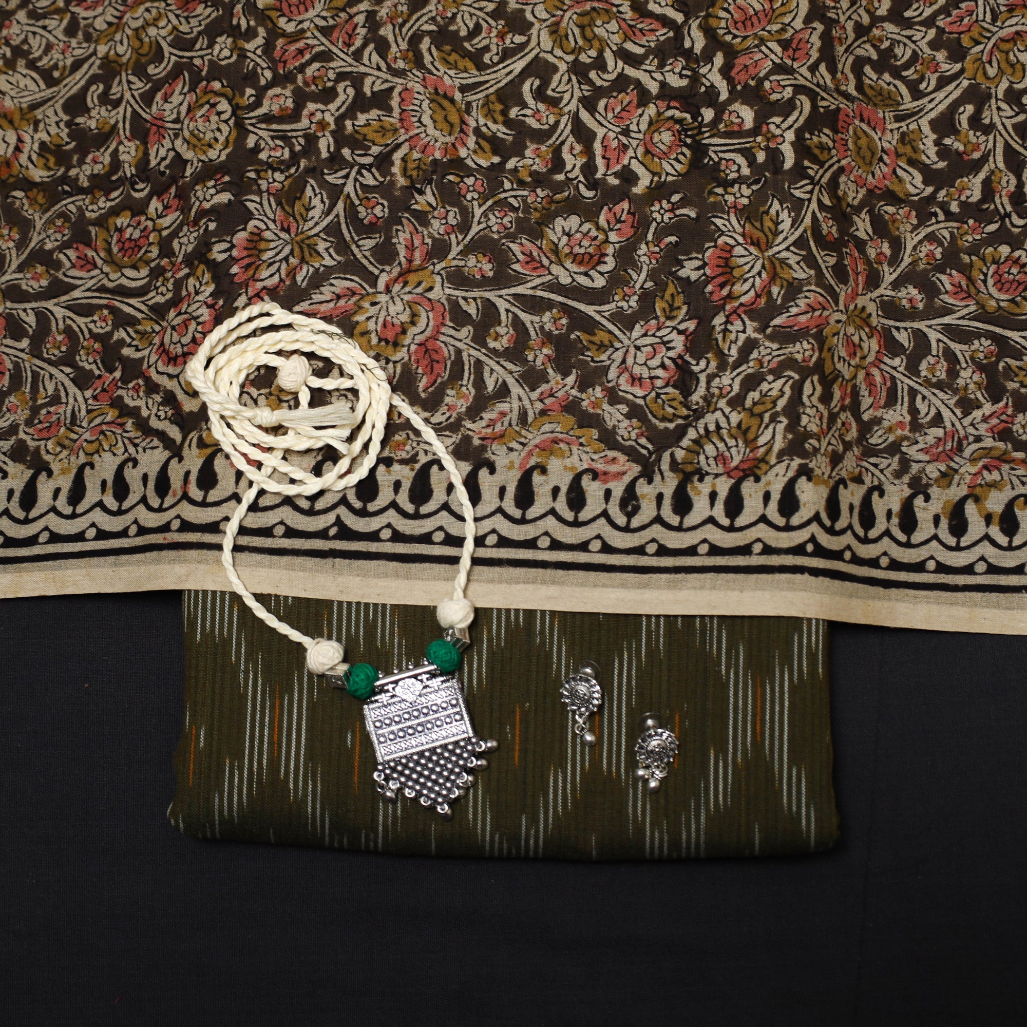 Pure cotton 2pc unstitched dress material set features pochampally ikat woven kurta fabric where the threads are dyed before weaving to create patterns. It is paired with kalamkari printed dupatta. The set also includes a handcrafted necklace and matching earrings.