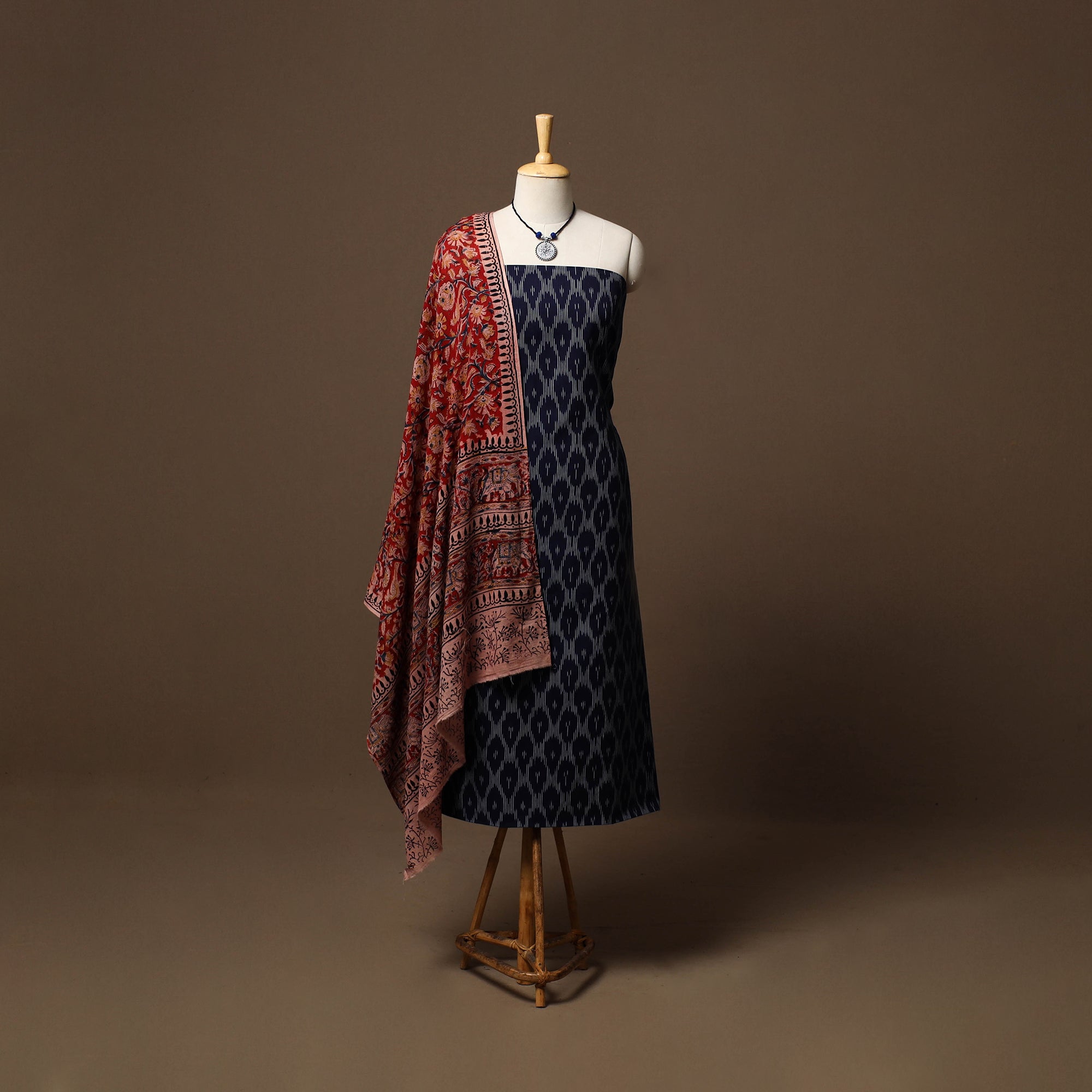 Pure cotton 2pc unstitched dress material set features pochampally ikat woven kurta fabric where the threads are dyed before weaving to create patterns. It is paired with kalamkari printed dupatta. The set also includes a handcrafted necklace and matching earrings.