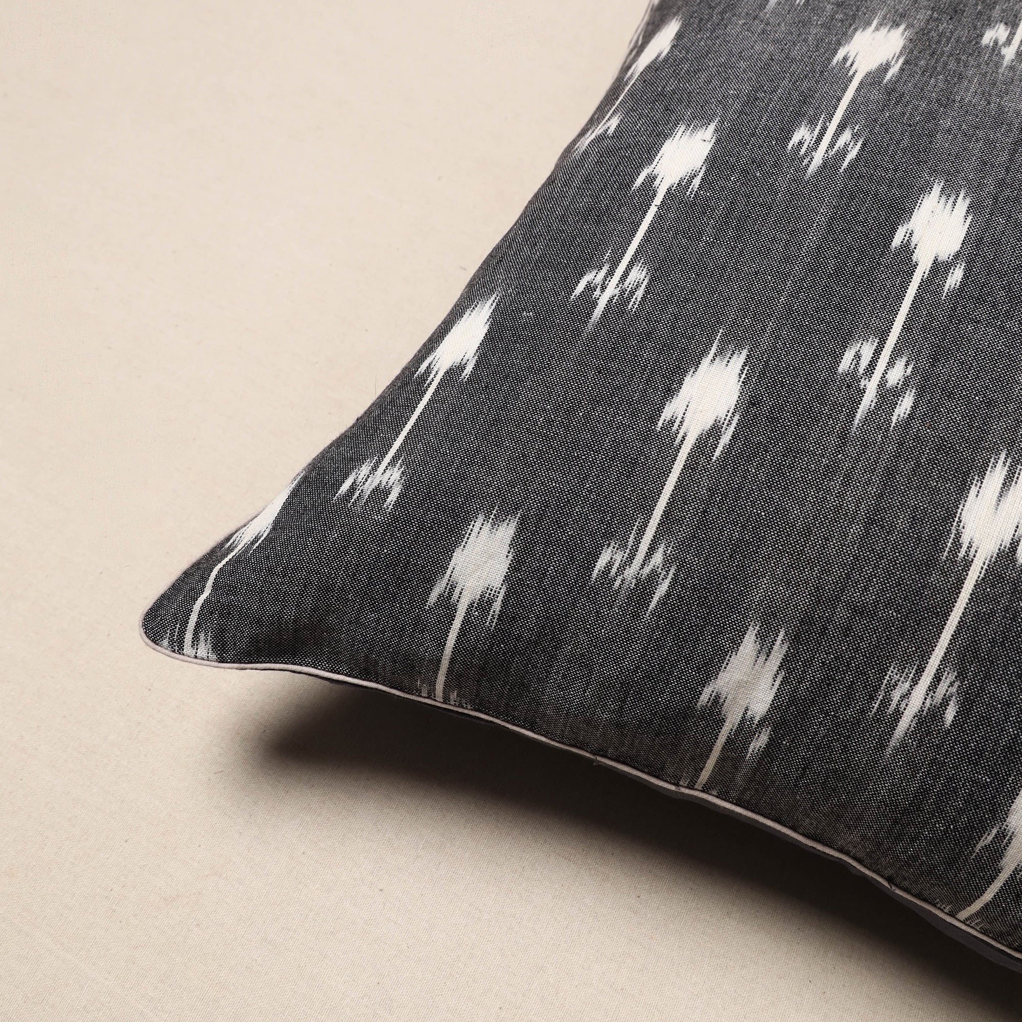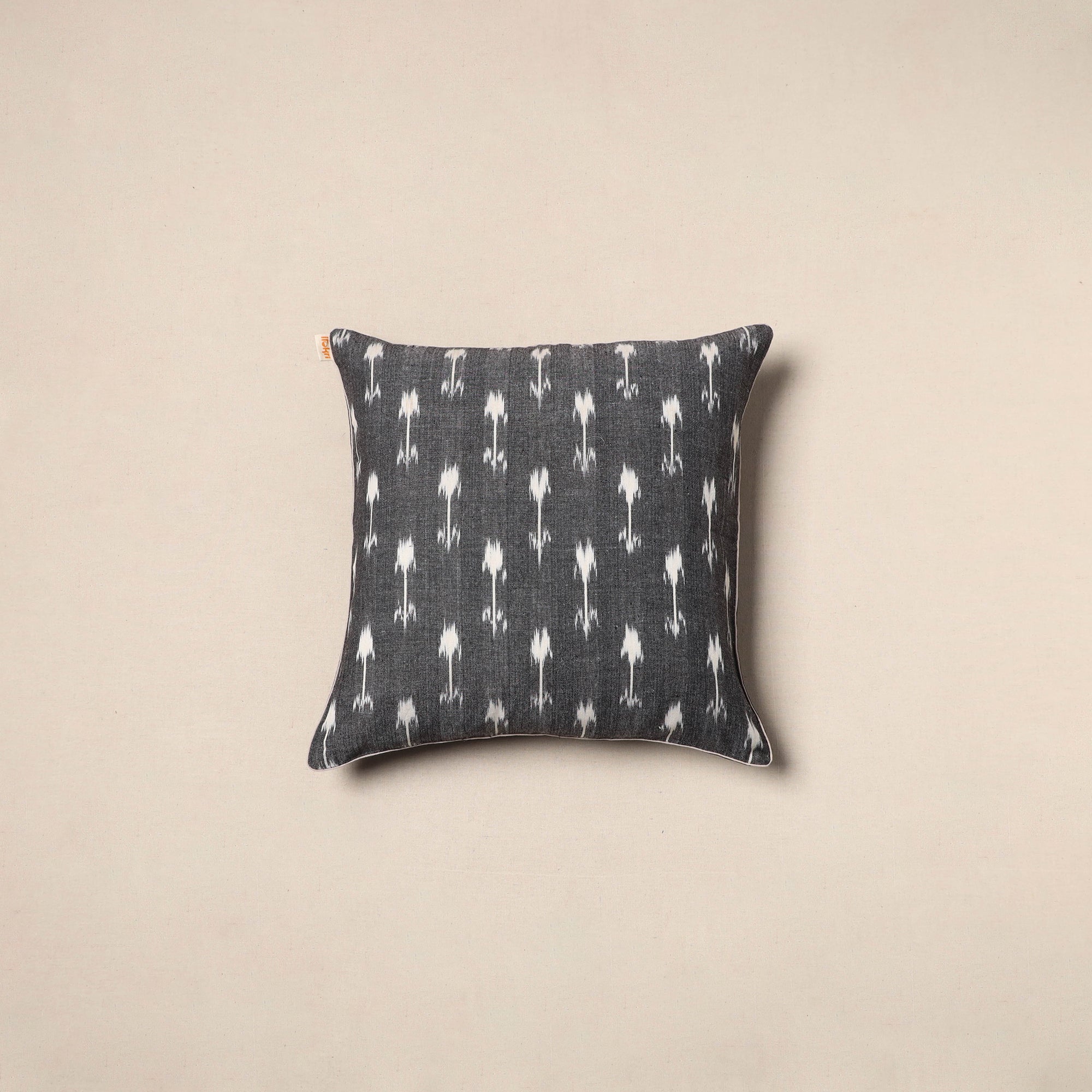 This grey pochampally Ikat cotton cushion cover is woven using traditional techniques from Telangana. The soft cotton base features bold Ikat patterns that create a distinct, eye-catching appeal. It is easy to maintain, washable, and blends beautifully with various home settings. A simple yet elegant way to bring color and charm to your sofa, chair, or bed.