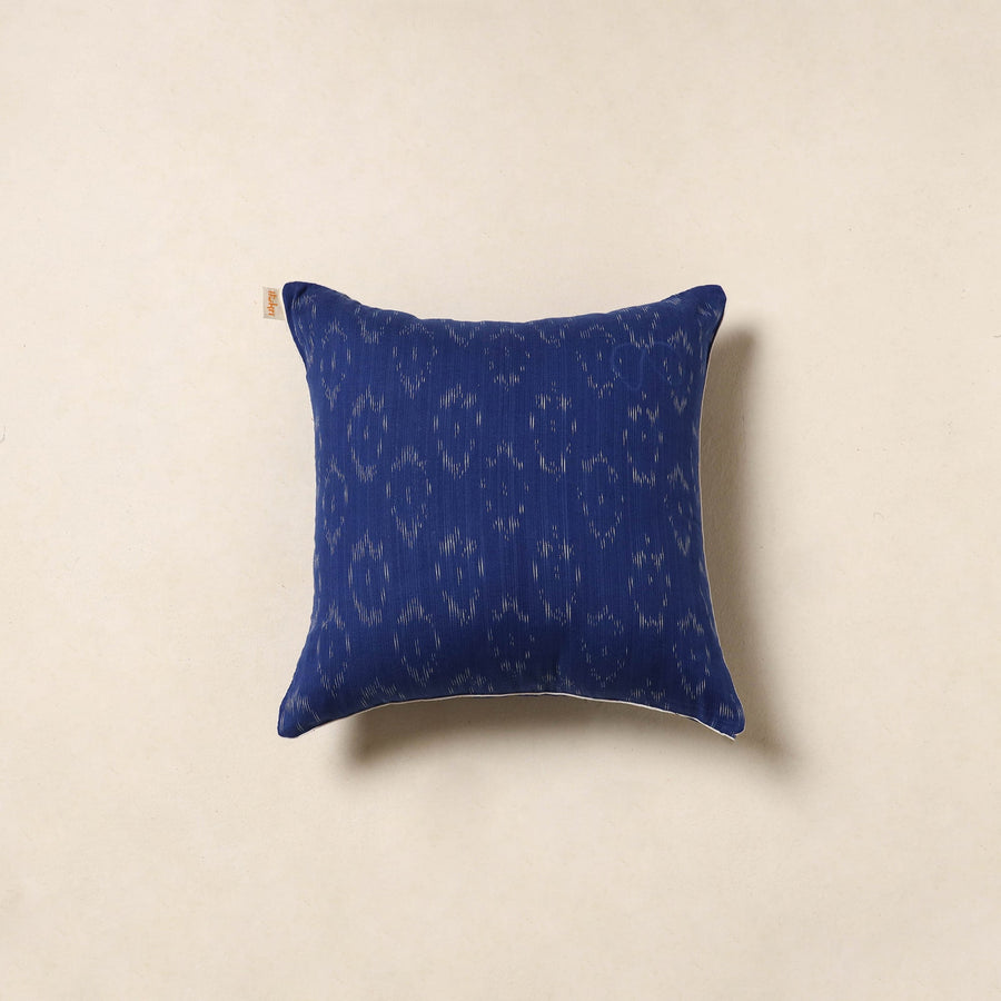 This blue pochampally ikat cotton cushion cover is made with traditional weaving from Telangana. The cotton fabric has bold Ikat patterns that give a unique look. It is easy to use, washable, and fits well with different home settings. A simple way to add color and style to your sofa, chair, or bed.
