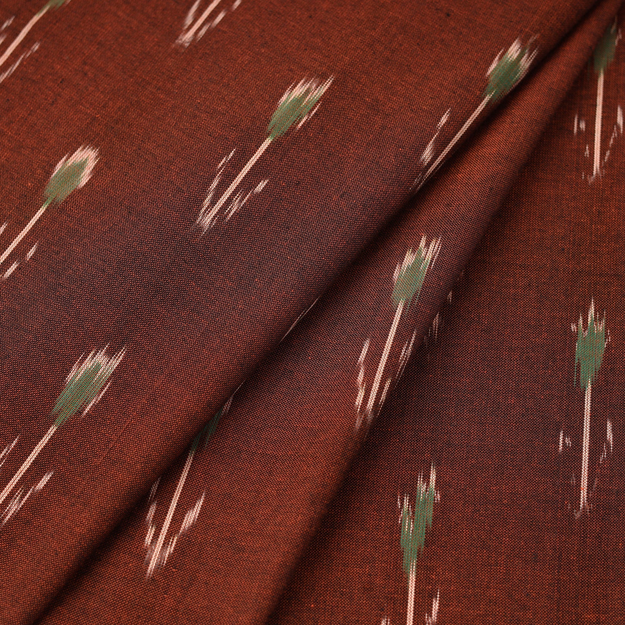 This brown cotton pochampally Ikat fabric is a traditional weave from Telangana, known for its precision and vibrant patterns. The designs are crafted using a resist-dyeing technique where threads are dyed before weaving, resulting in striking geometric motifs. Appreciated for its rich texture, this fabric is ideal for ethnic wear, home décor, or creative sewing projects.