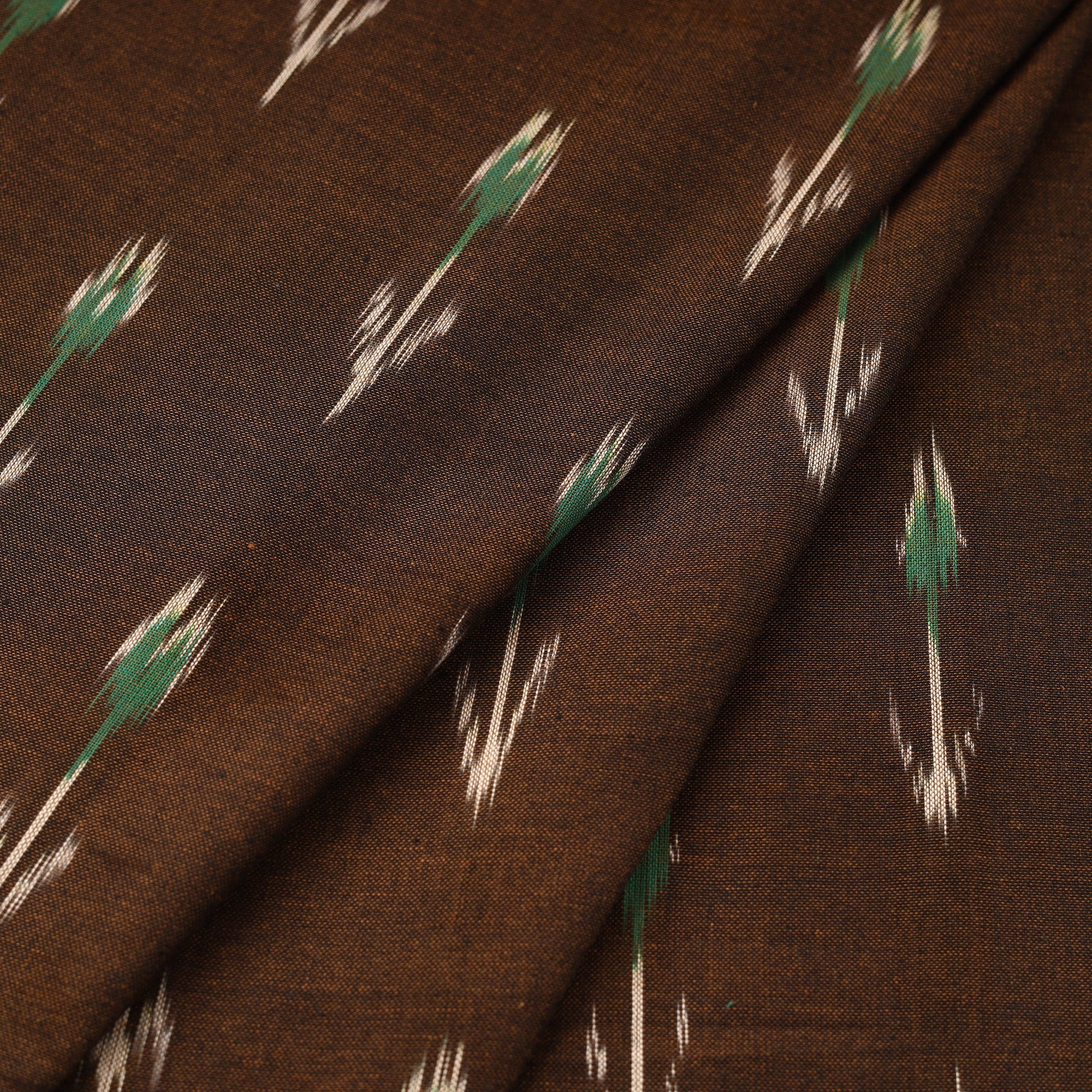 This brown cotton pochampally Ikat fabric is a traditional weave from Telangana, known for its precision and vibrant patterns. The designs are crafted using a resist-dyeing technique where threads are dyed before weaving, resulting in striking geometric motifs. Appreciated for its rich texture, this fabric is ideal for ethnic wear, home décor, or creative sewing projects.